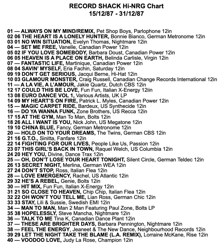 The chart below is a Hi-NRG Chart published by the Record Shack shop in December 1987. The Record Shack shop in Berwick Street closed in around 1988.
