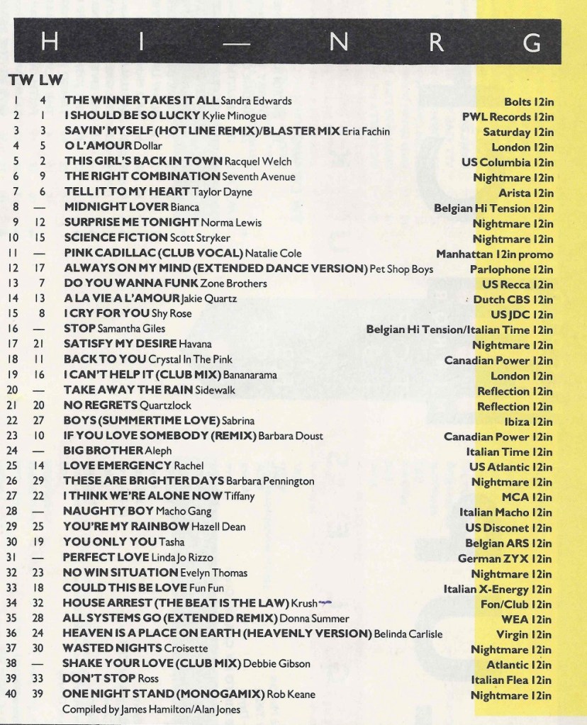 A scan of the original printed Record Mirror Eurobeat Chart from 20th February 1988