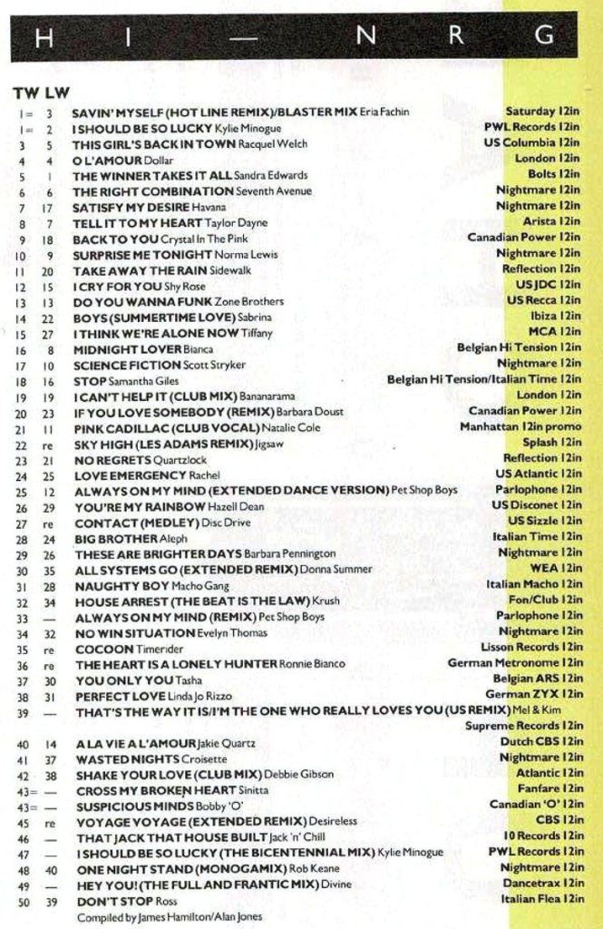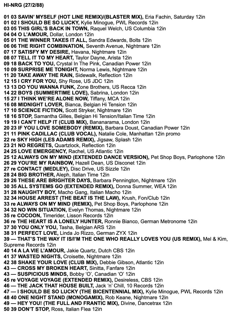 A scan of the original printed Record Mirror Eurobeat Chart from 27th February 1988