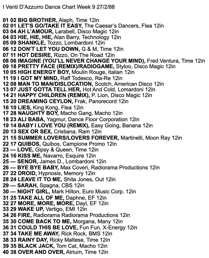 I Venti d’Azurro Italo Disco Chart 27th February 1988