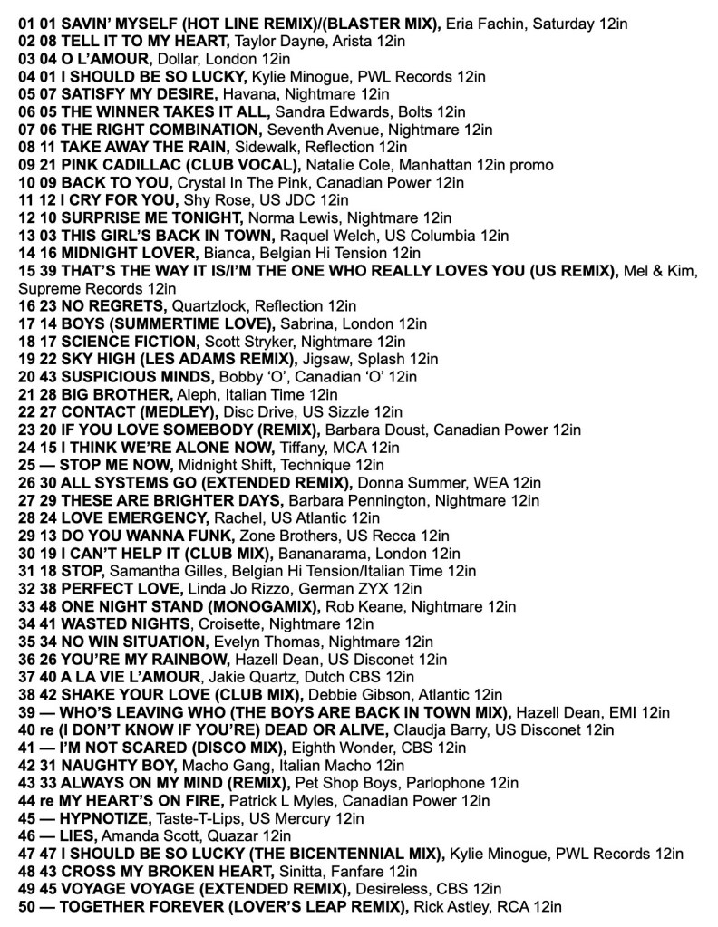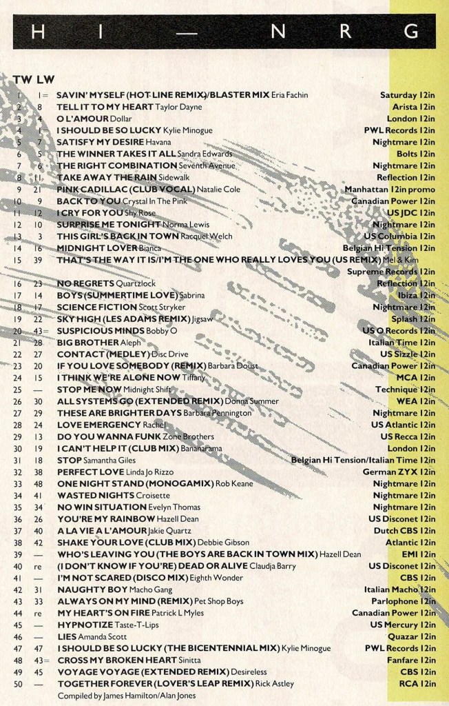 A scan of the original printed Record Mirror Eurobeat Chart from 5th March 1988