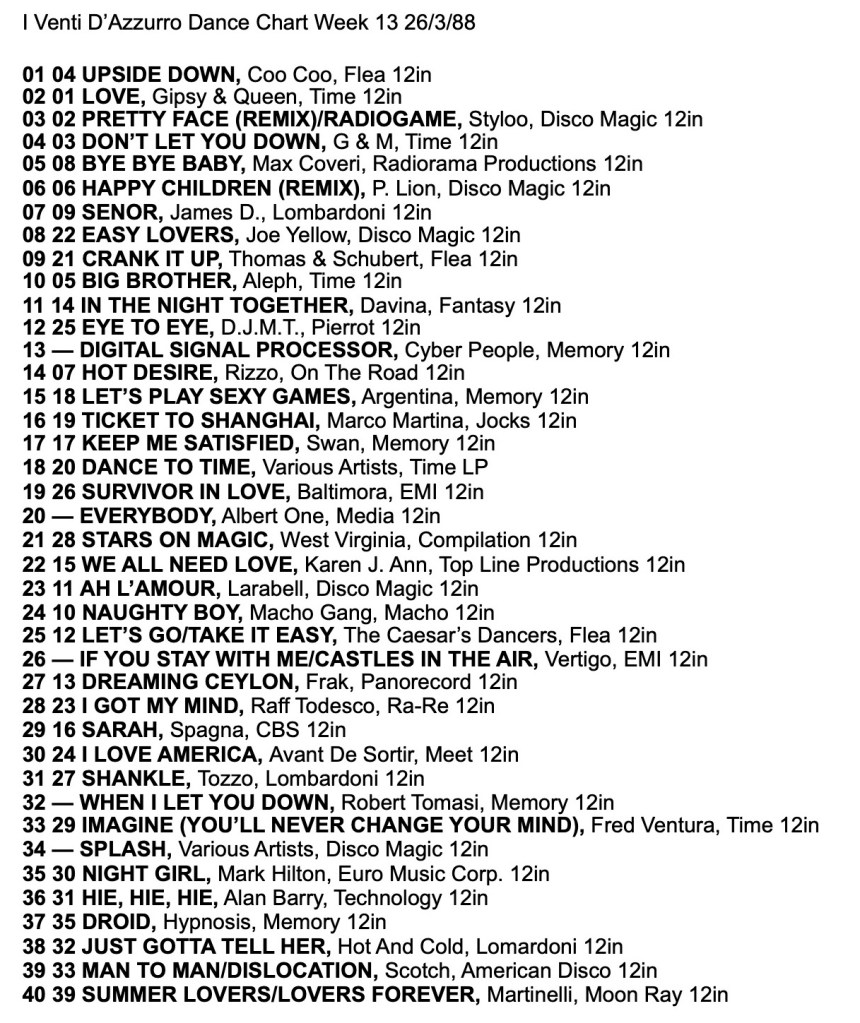 I Venti d’Azurro Italo Disco Chart 26th March 1988
