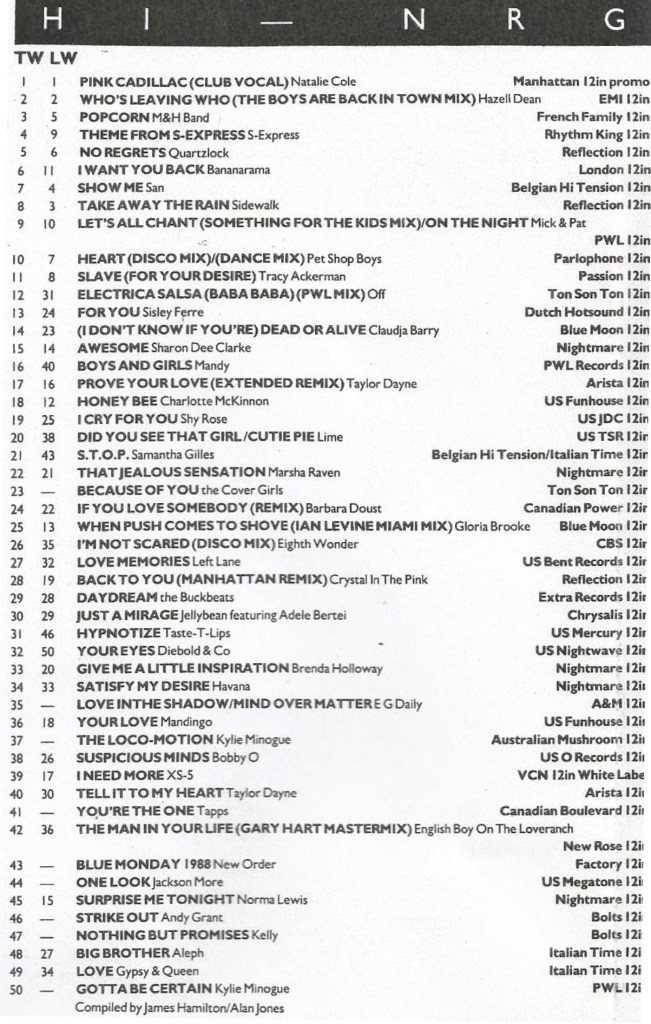 A scan of the original printed Record Mirror Eurobeat Chart from 14th May 1988