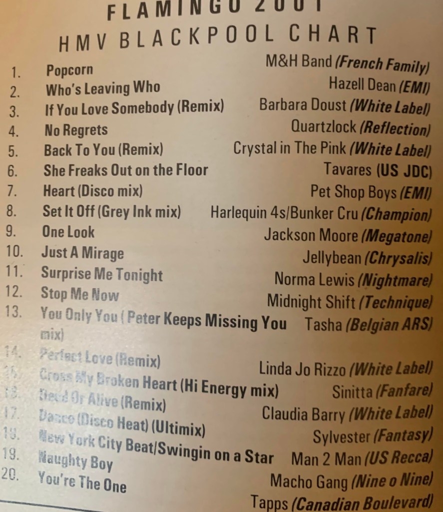 The club contributed a Hi-NRG chart to various publications like Gay Times and Gay News. The below is a Flamingo 2001 club chart, coupled with sales of the records from the local HMV record shop. This chart was published either in Gay Times or Him magazine (unfortunately I don’t know which one), and was published at some point in the Spring/early Summer of 1988.