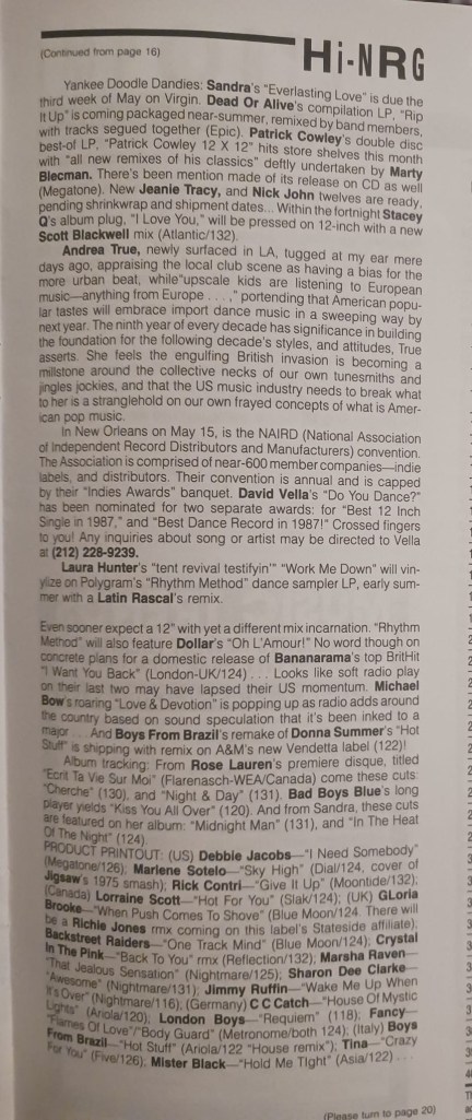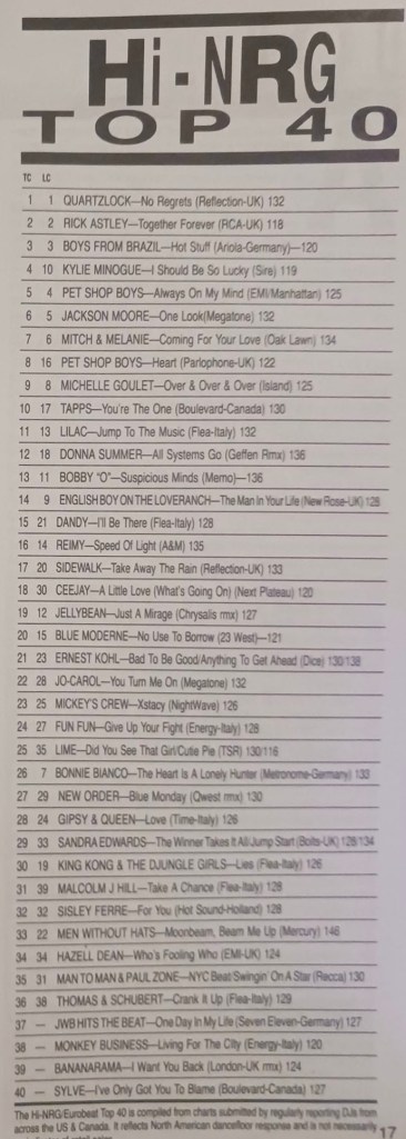 Although these charts mirrored the Record Mirror Hi-NRG charts to some extent, they were also an excellent alternative to the more predictable Record Mirror Hi-NRG charts, which seemed to be stuffed full of a certain London DJ and producer’s productions on his own record label.