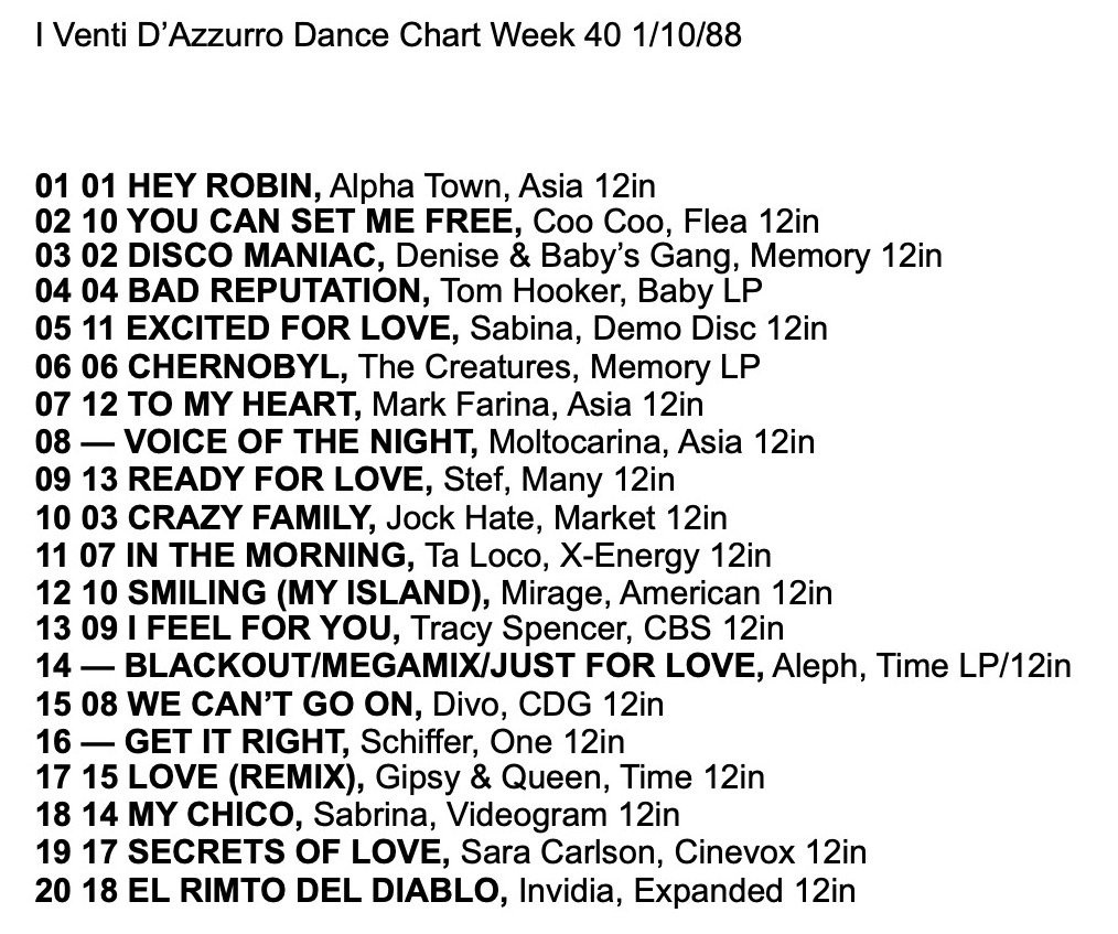 I Venti d’Azurro Italo Disco Chart 1st October 1988