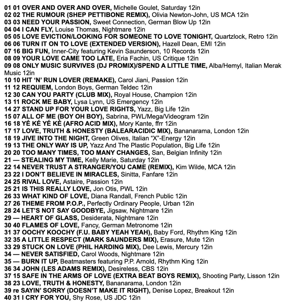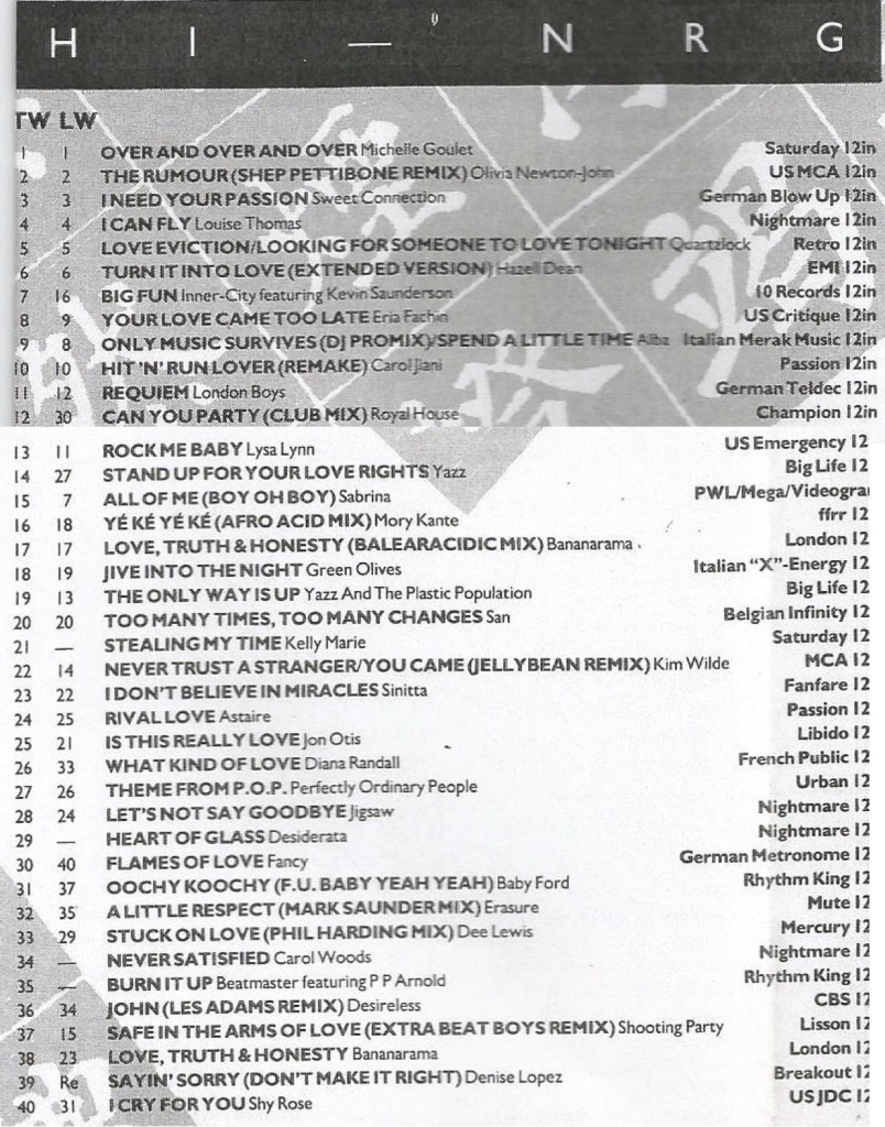 A scan of the original printed Record Mirror Eurobeat Chart from 5th November 1988