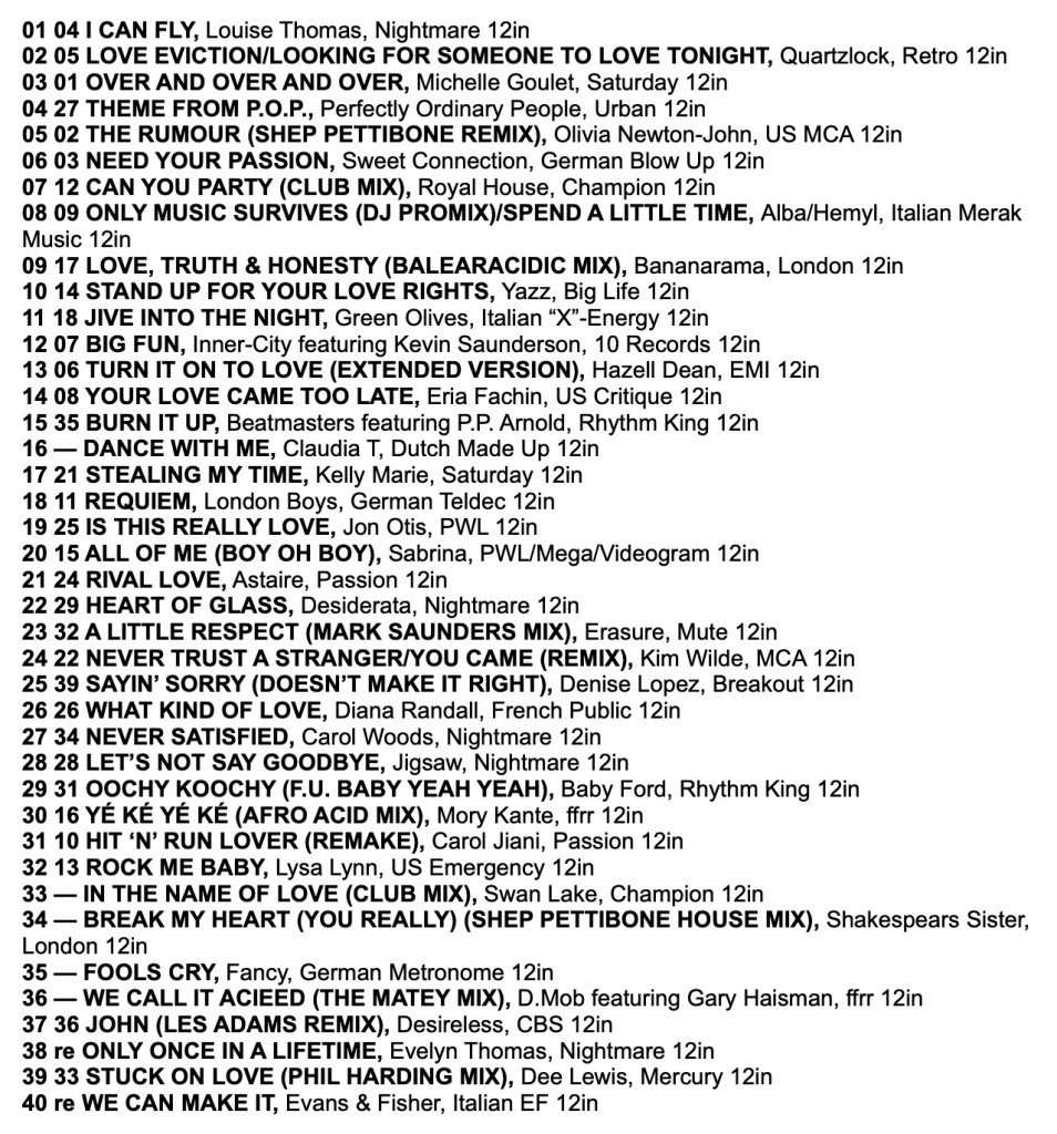 A scan of the original printed Record Mirror Eurobeat Chart from 12th November 1988