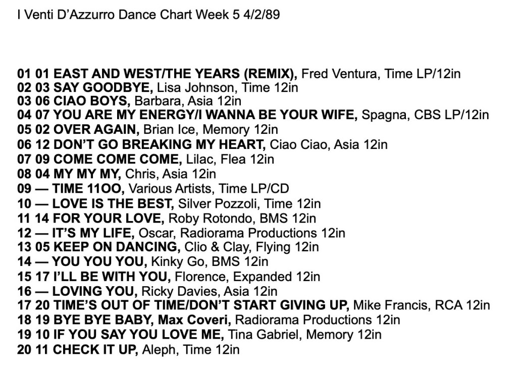 I Venti d’Azurro Italo Disco Chart 4th February 1989