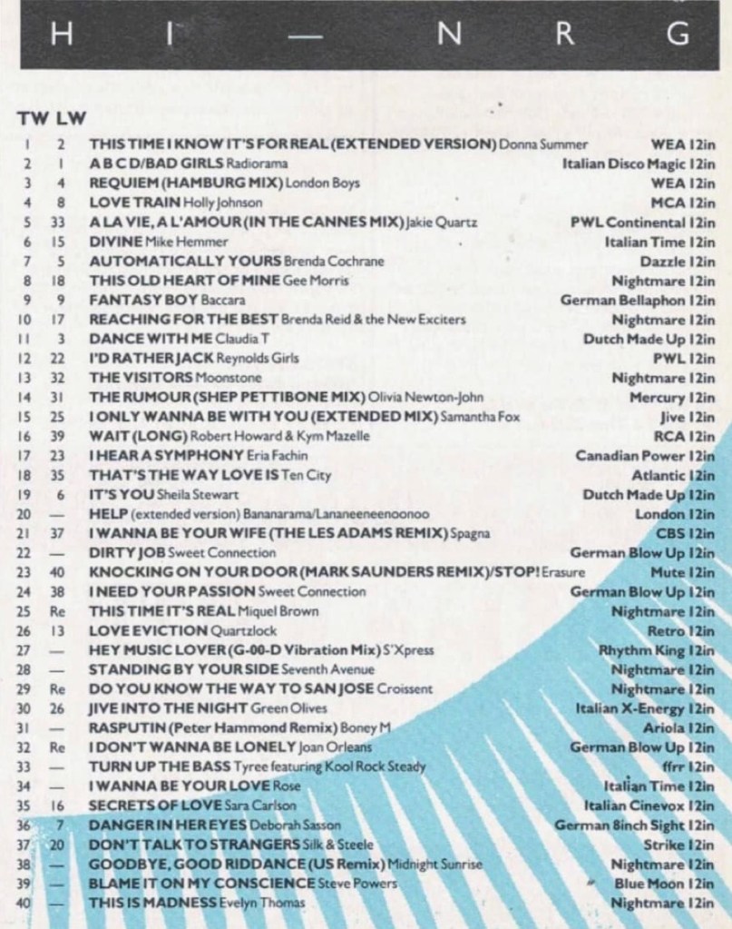 This would be the last ever Hi-NRG chart printed by Record Mirror