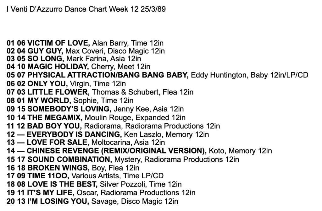 I Venti d’Azurro Italo Disco Chart 25th March 1989