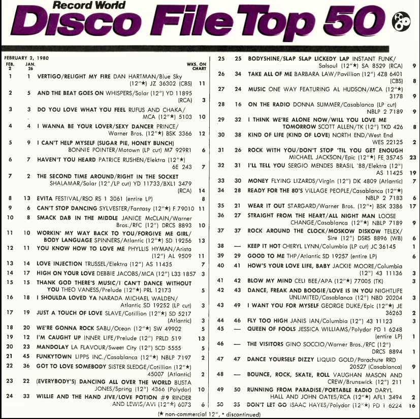 Record World Disco File Chart 2nd February 1980