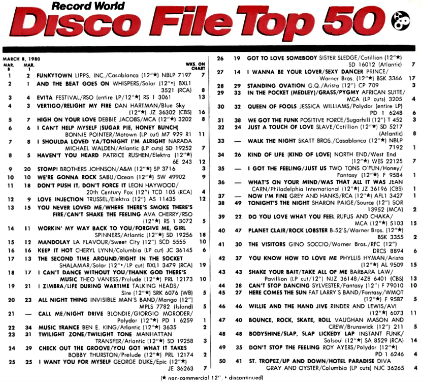 Record World Disco File Chart 8th March 1980