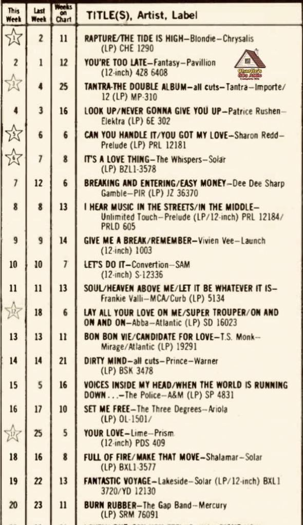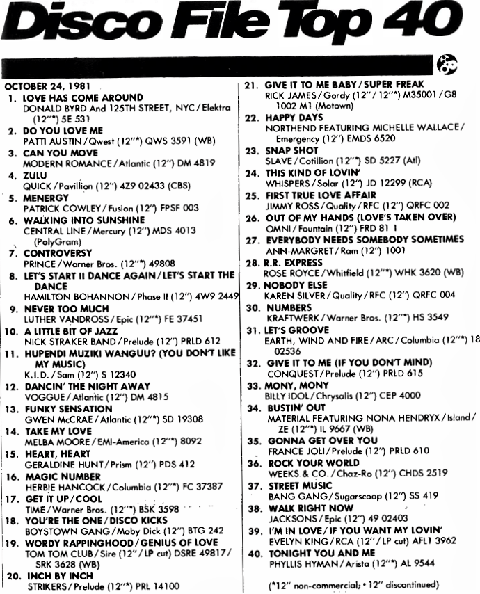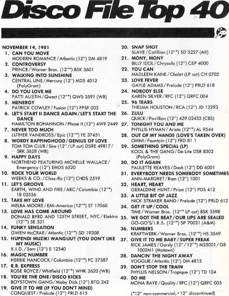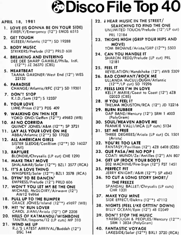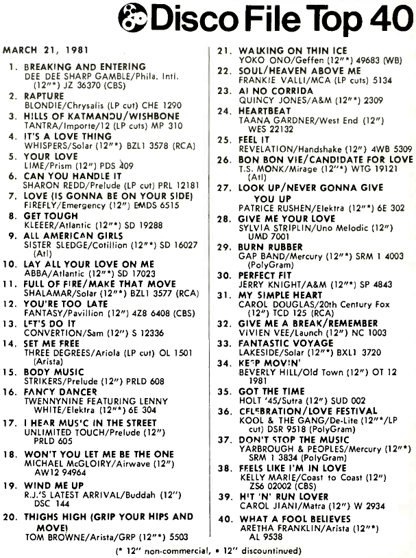 The charts in this blog are taken from the 1981 issues of Record World Magazine and Billboard Magazine Disco Dance Charts in the USA, and Record Business in the UK.