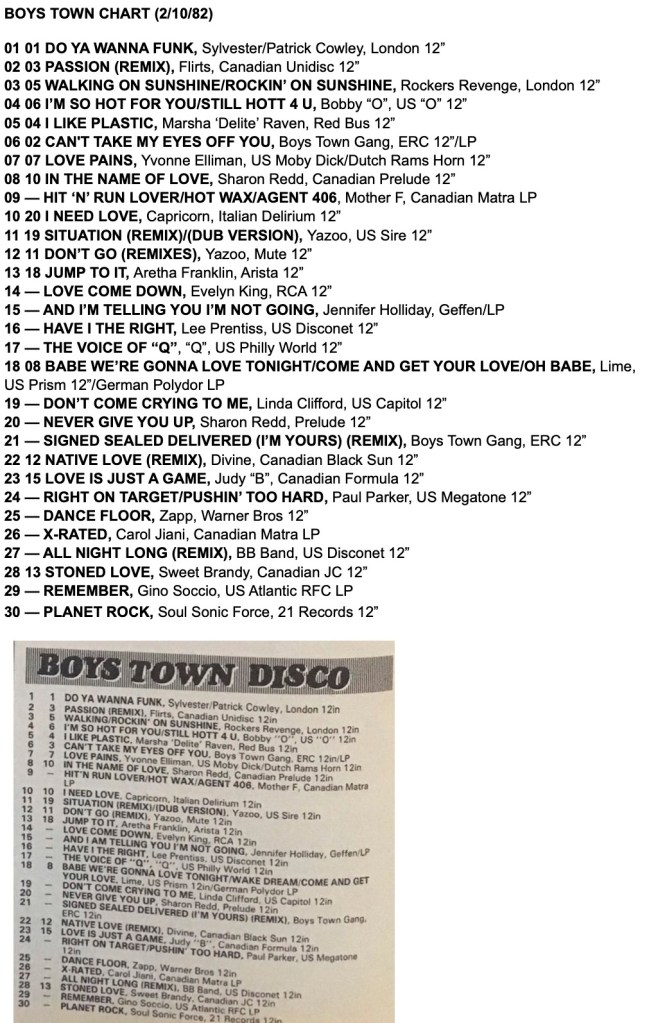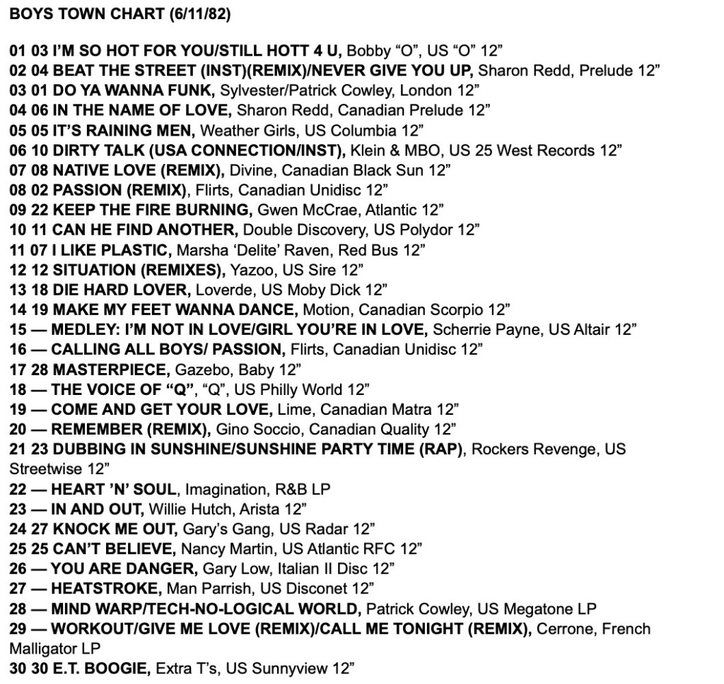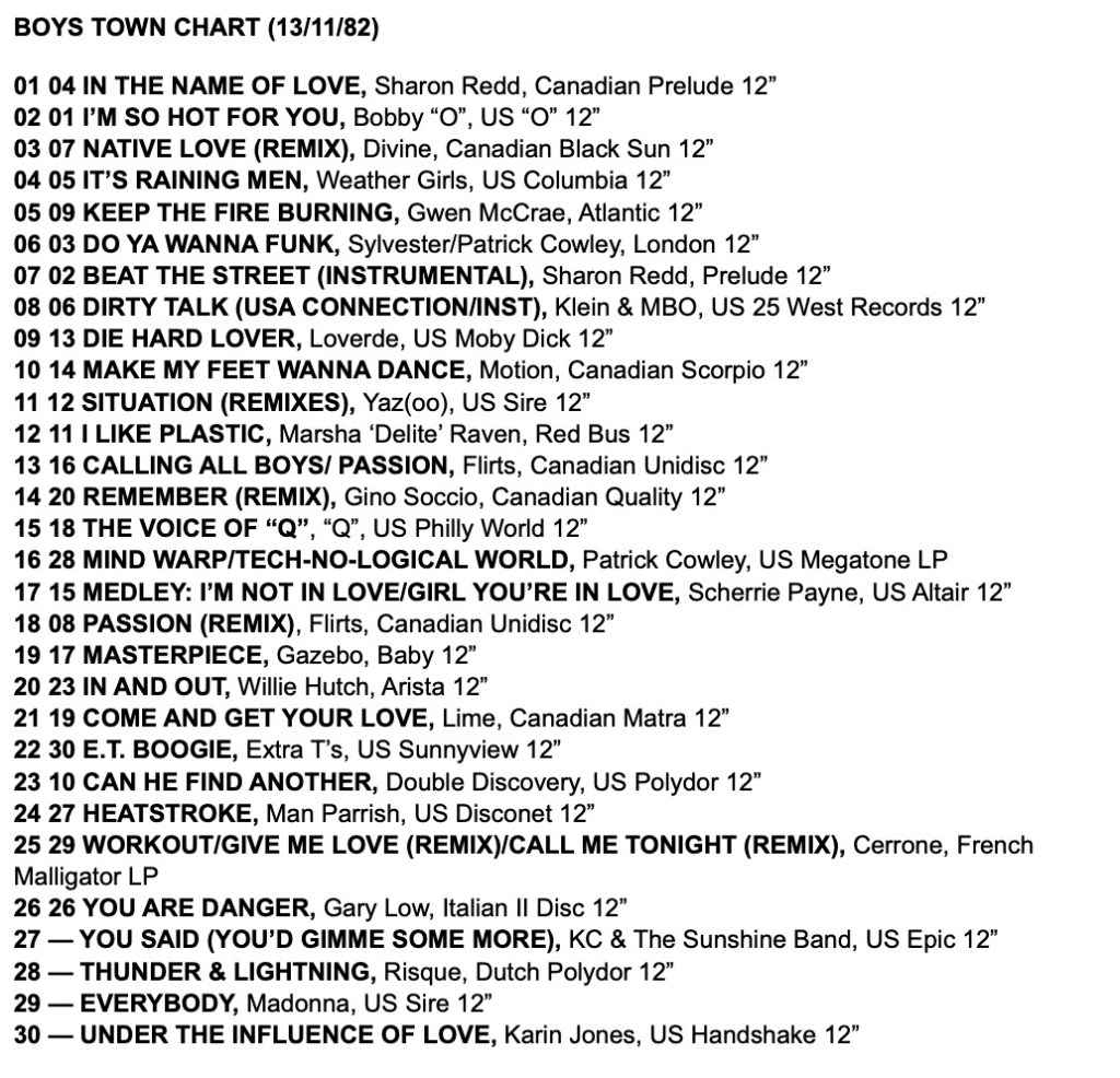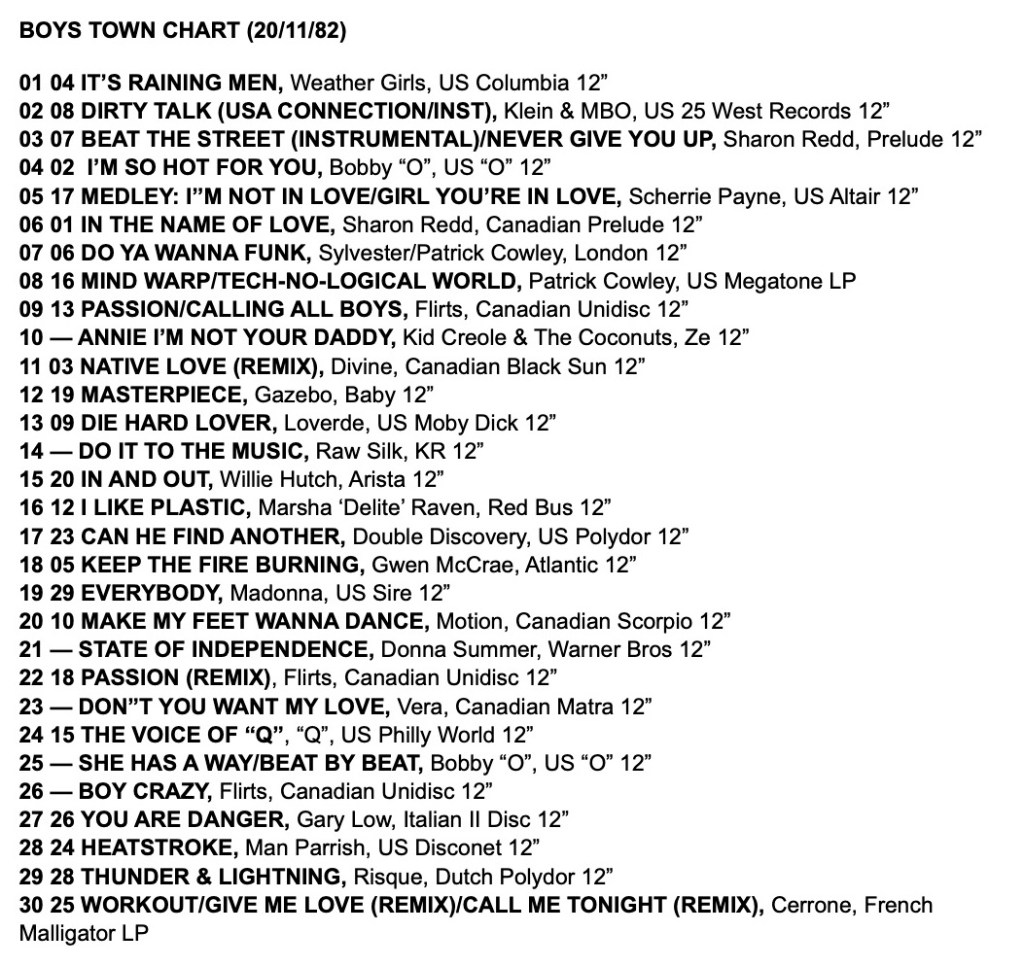 Using the same methods that James Hamilton and Alan Jones used when compling the charts, here are the top 30 Boystown Disco tracks from the Record Mirror chart entries of 1982.