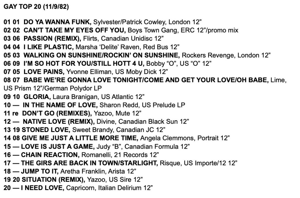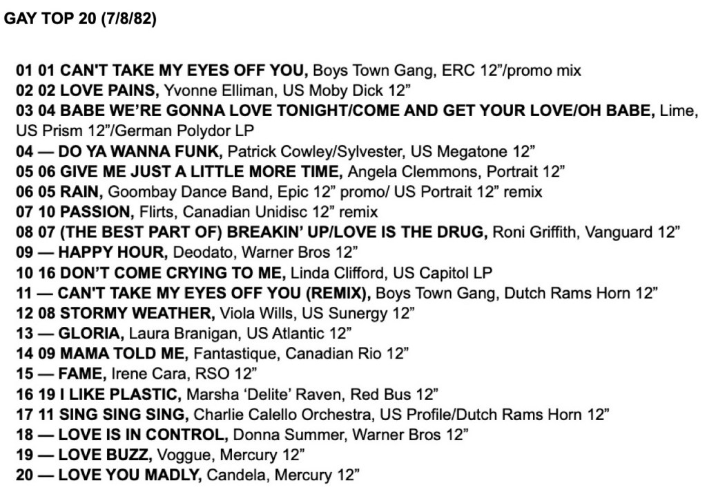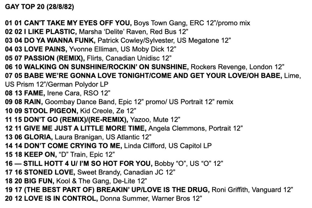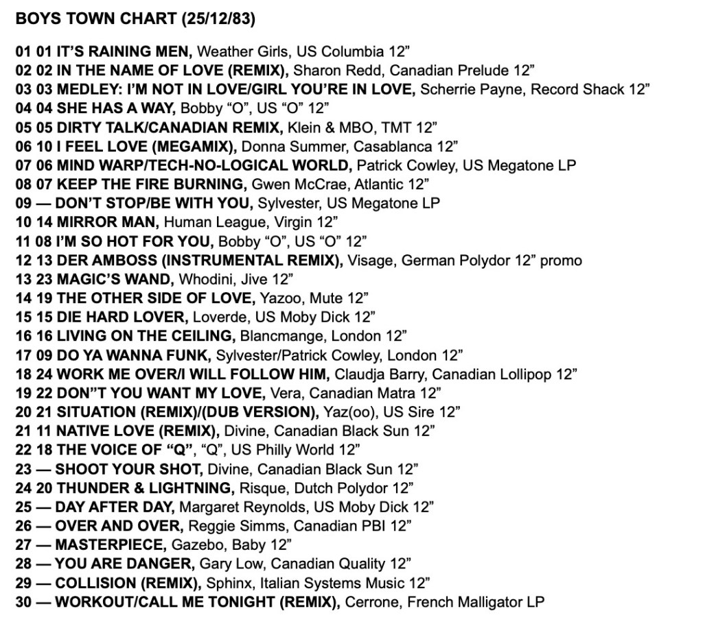 Using the same methods that James Hamilton and Alan Jones used when compling the charts, here are the top 30 Boystown Disco tracks from the Record Mirror chart entries of 1982.