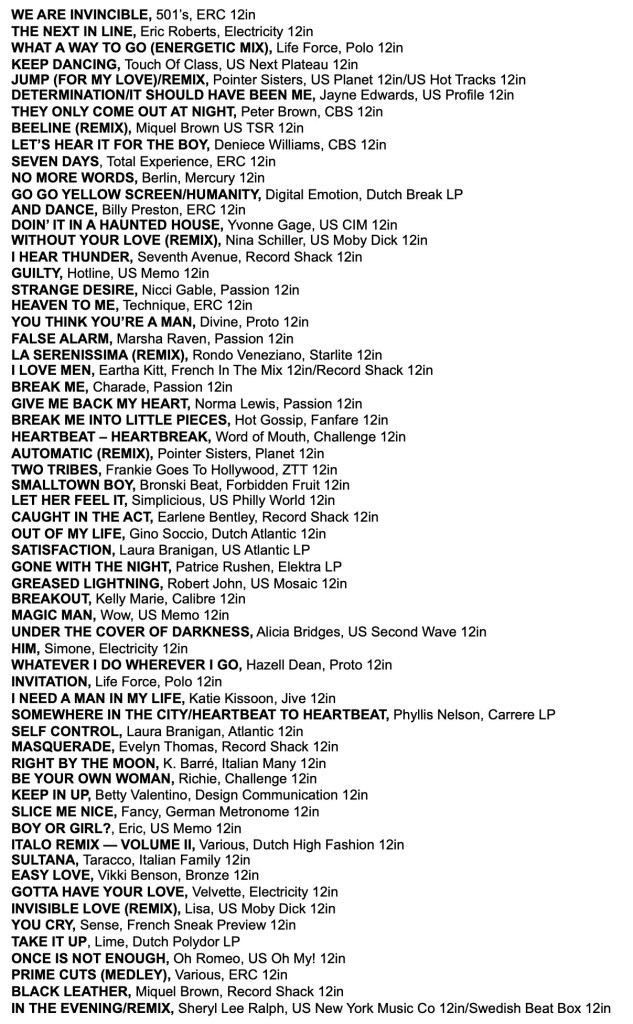 Based on the number of entries each artist had in these charts, below is a list of leading Hi-NRG and Boystown artists from the 80s. The list is in order of those artists with the most individual song entries, and does not include remixes of the same song.