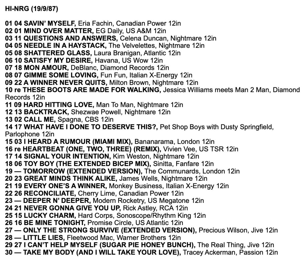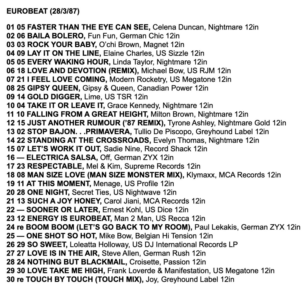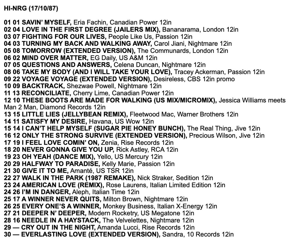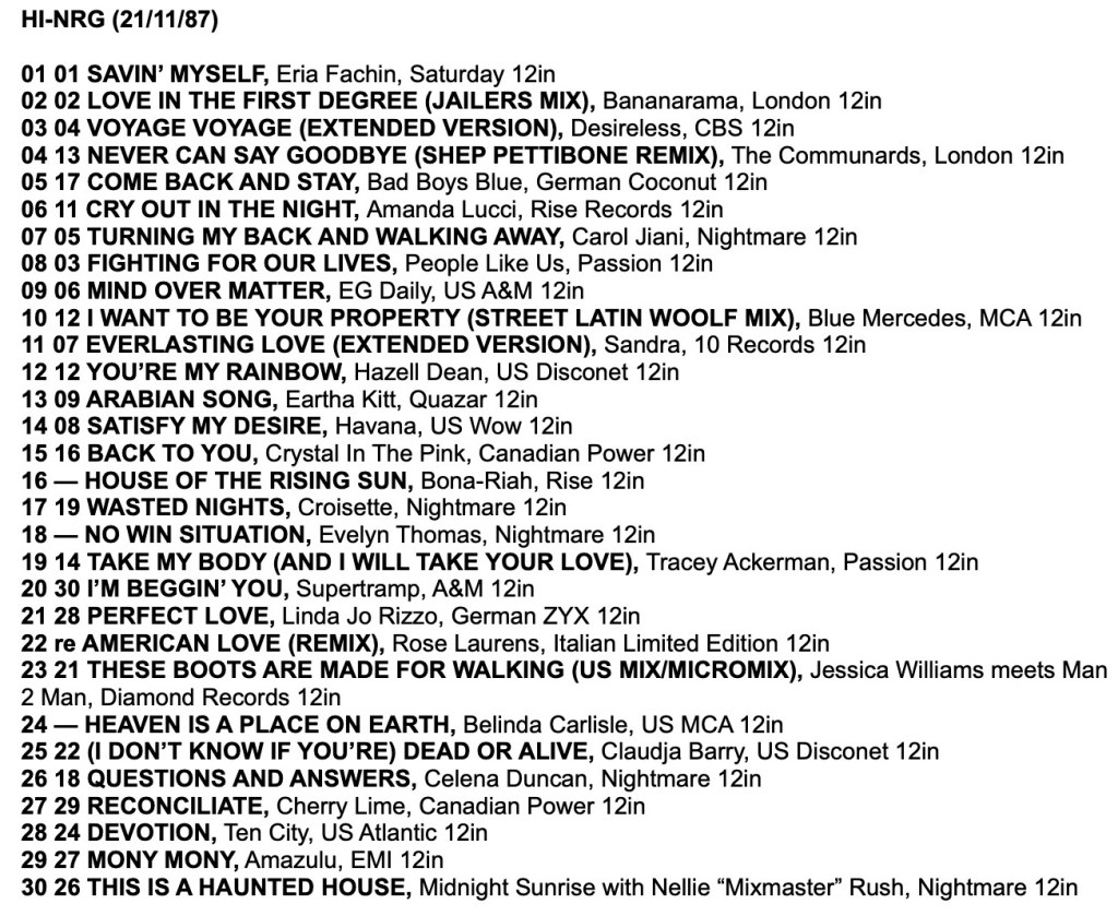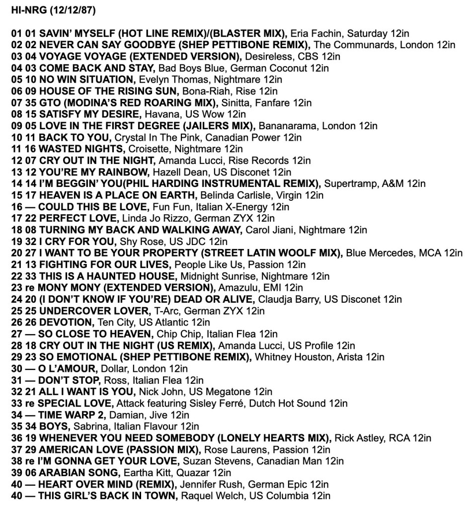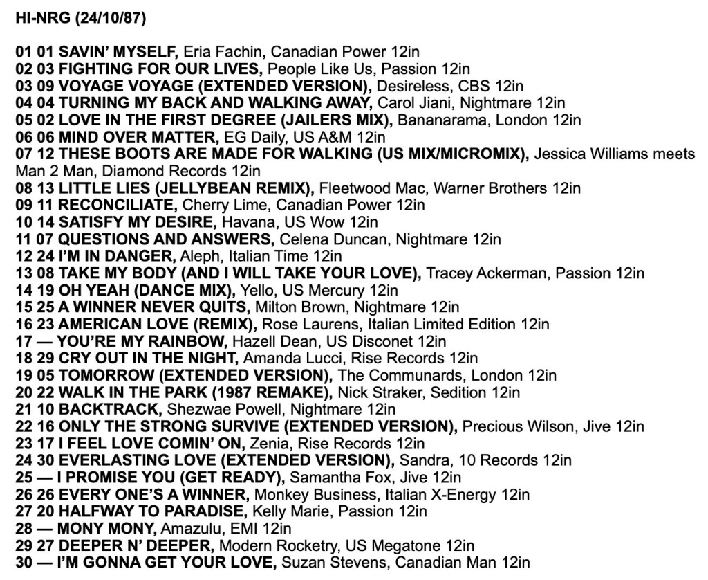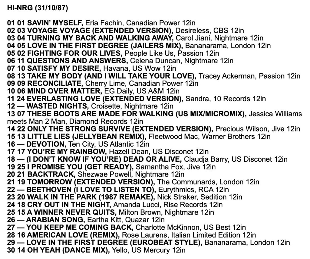 As a taste for the tracks in these charts, here is a mix I made from the Record Mirror Top 50 Hi-NRG tracks of 1987: