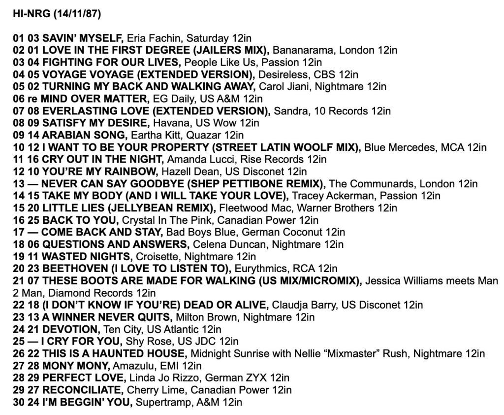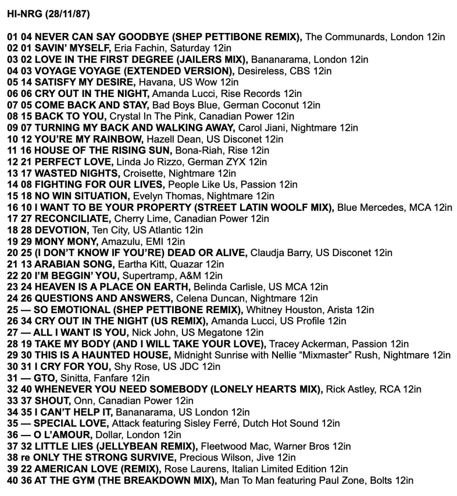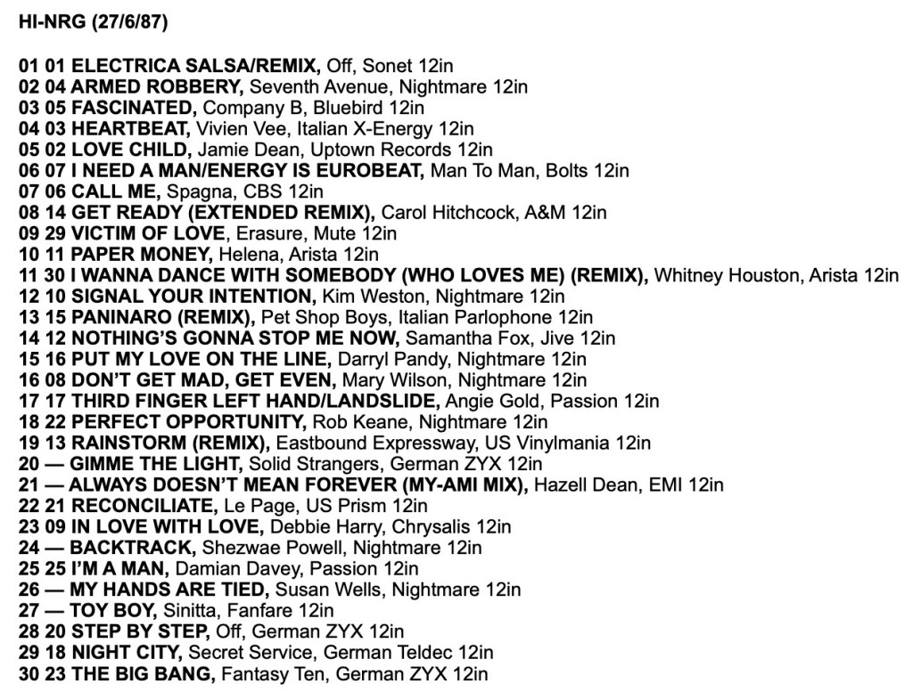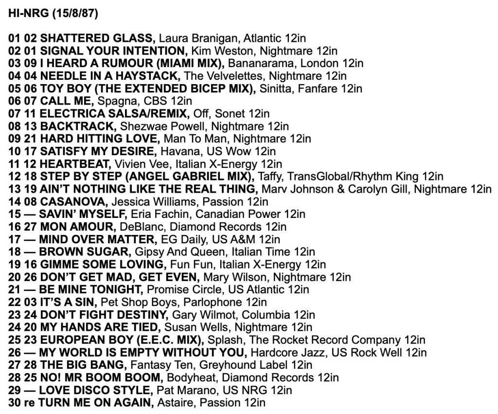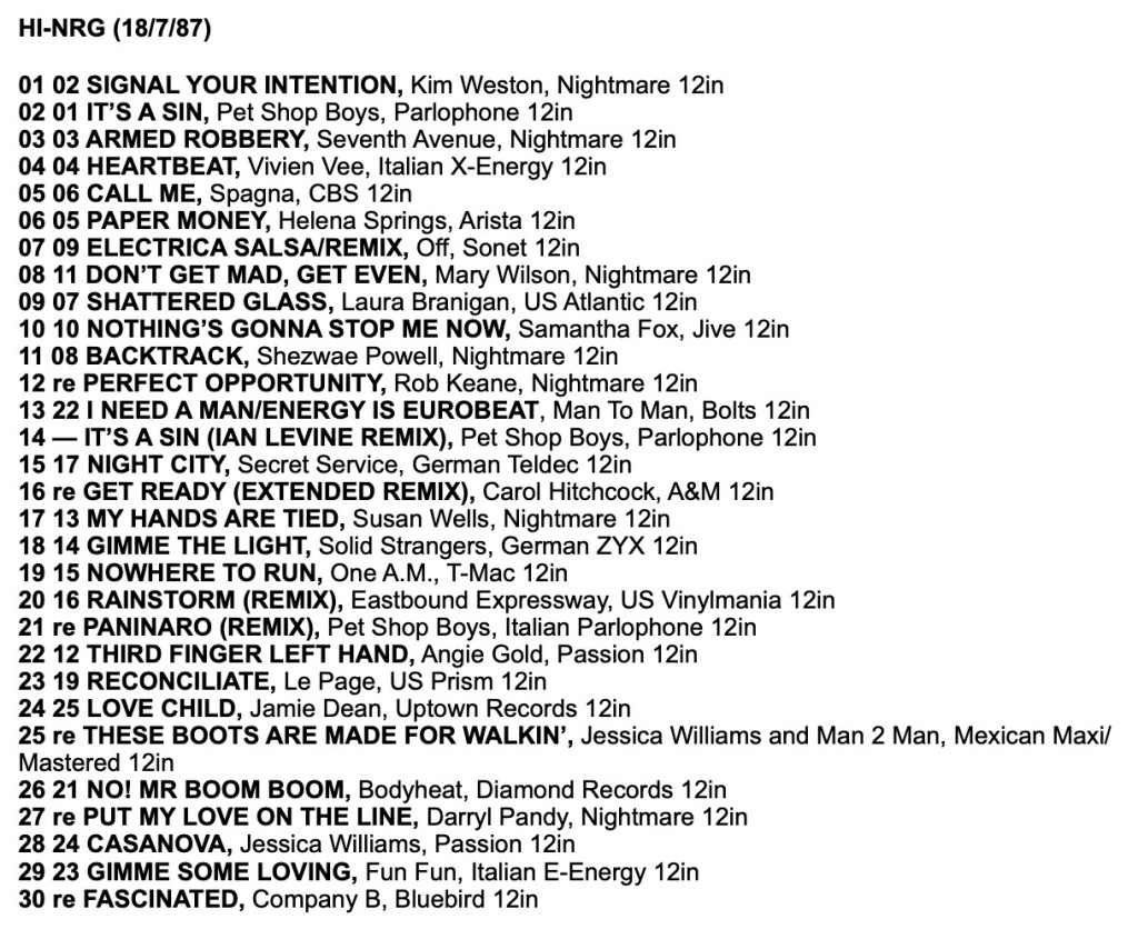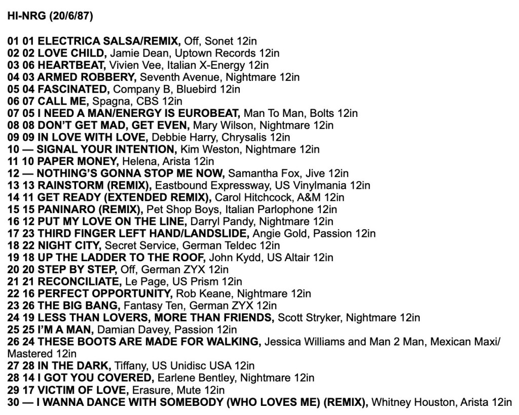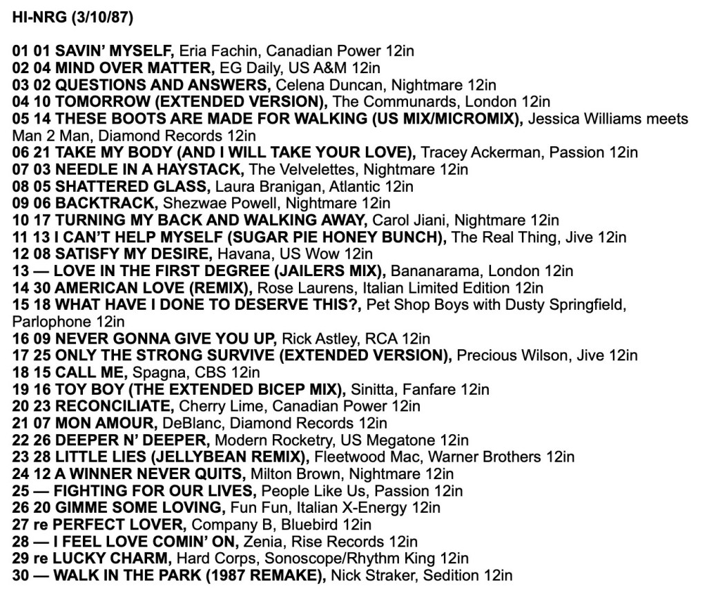 As a taste for the tracks in these charts, here is a mix I made from the Record Mirror Top 50 Hi-NRG tracks of 1987:
