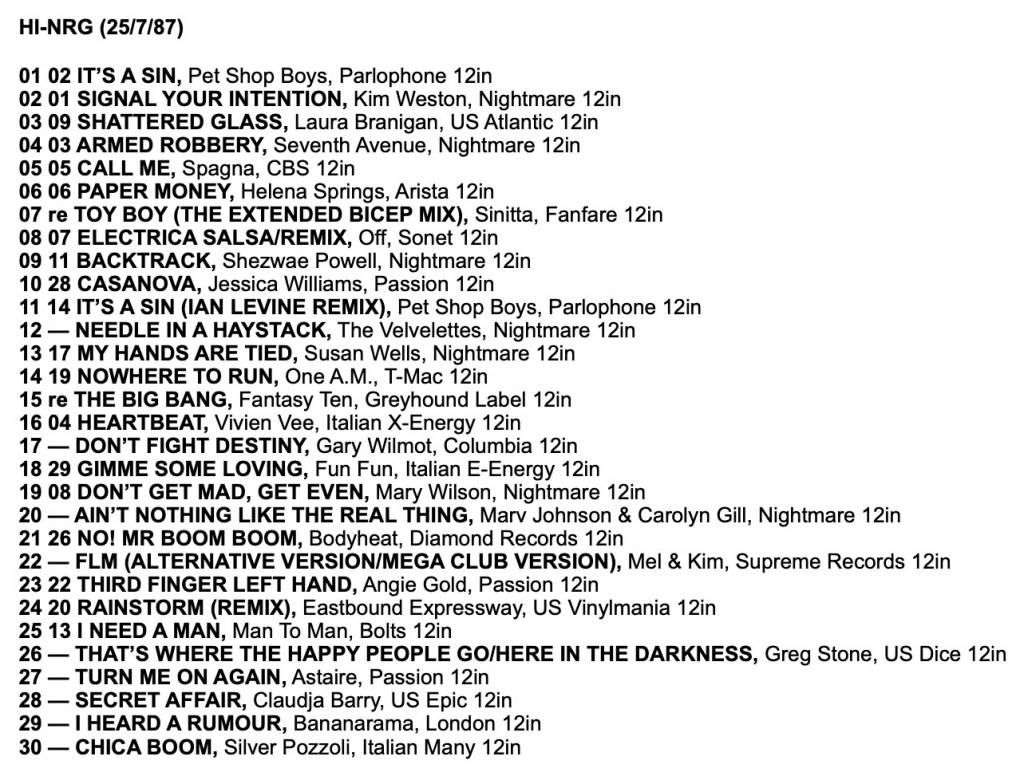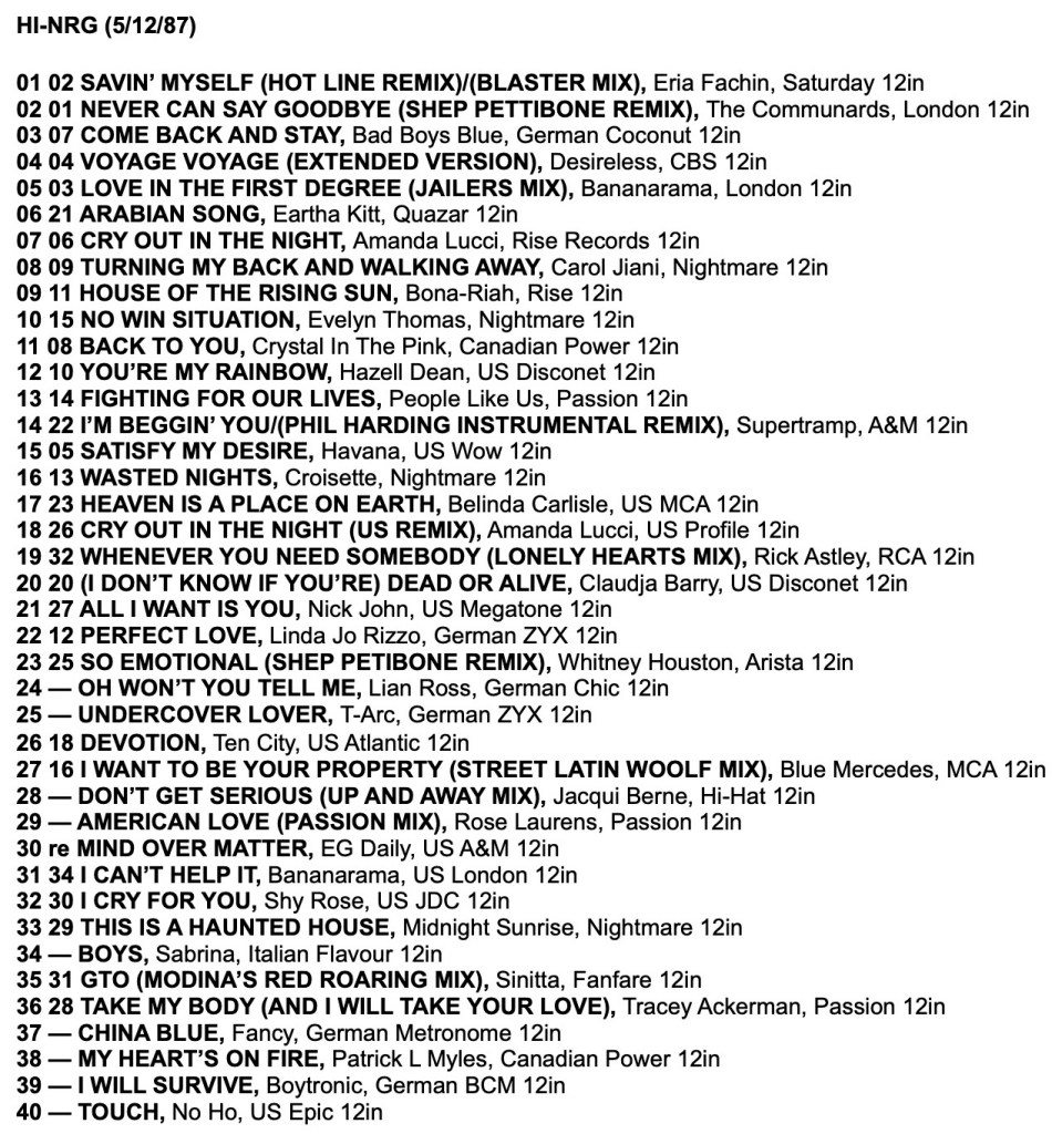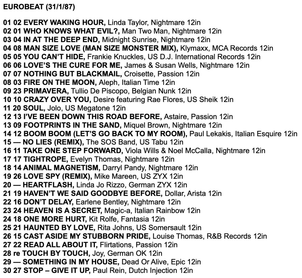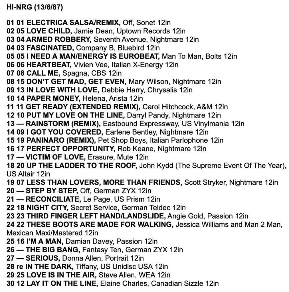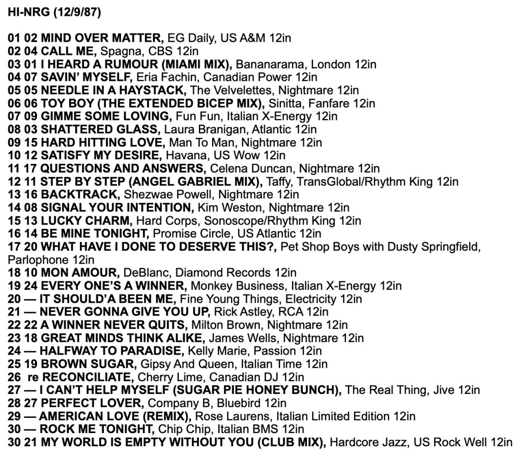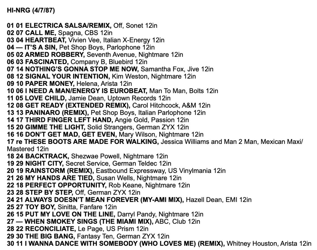 As a taste for the tracks in these charts, here is a mix I made from the Record Mirror Top 50 Hi-NRG tracks of 1987: