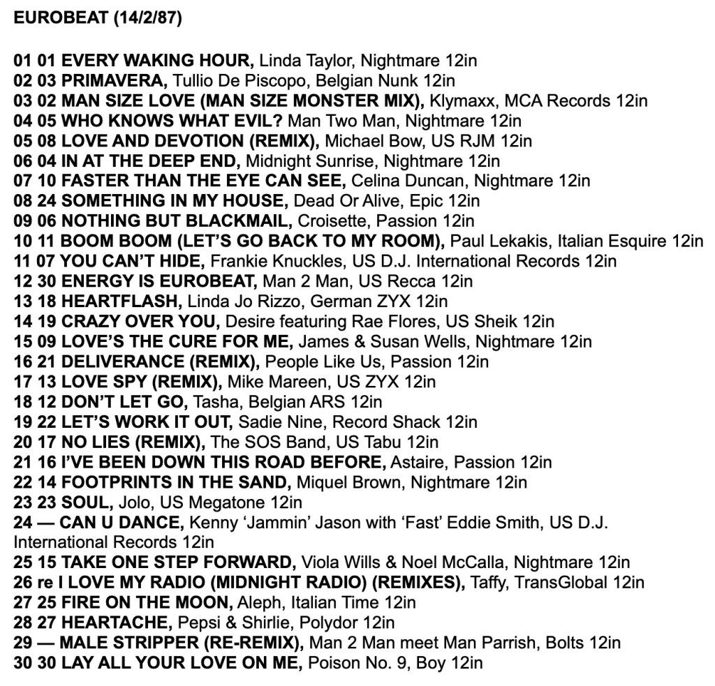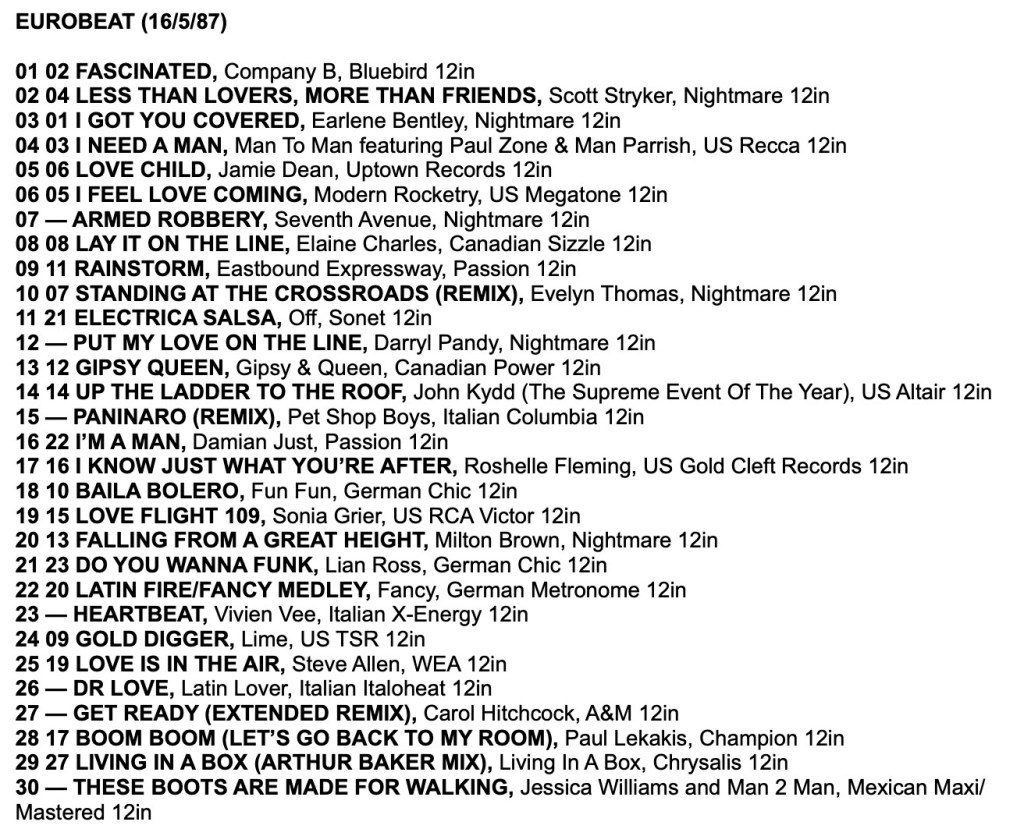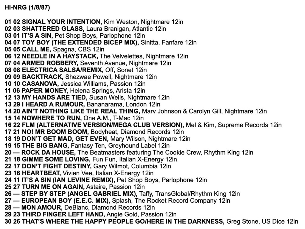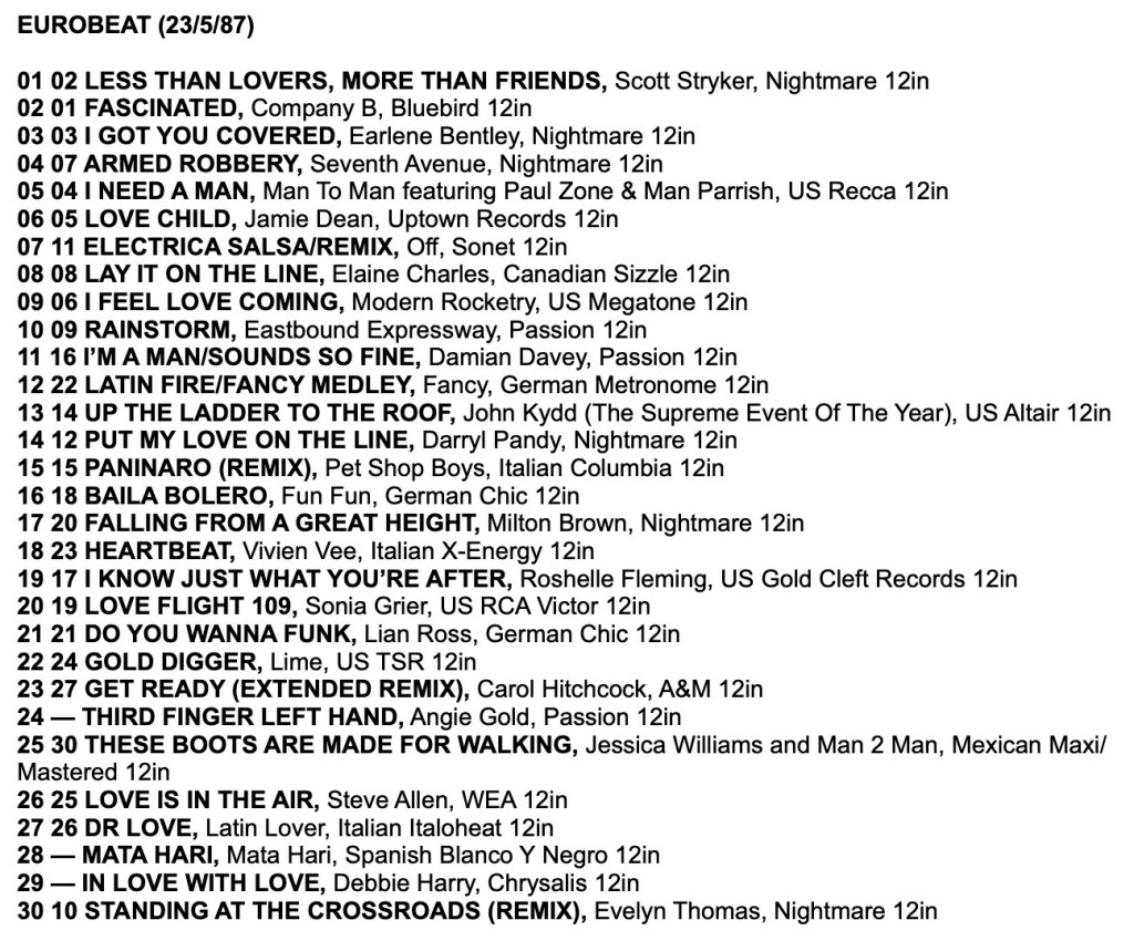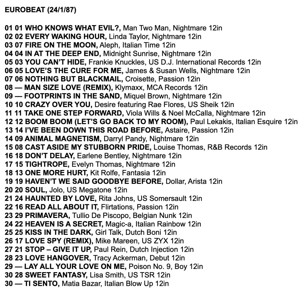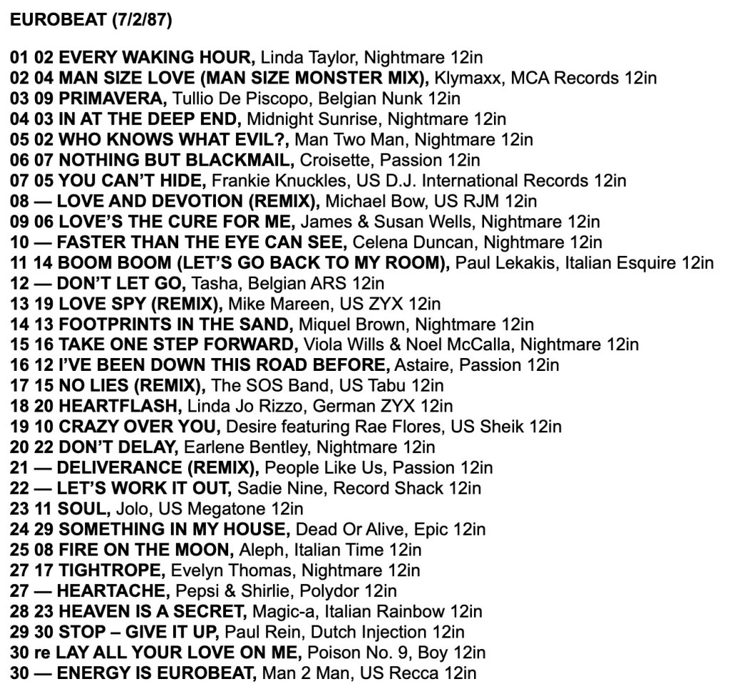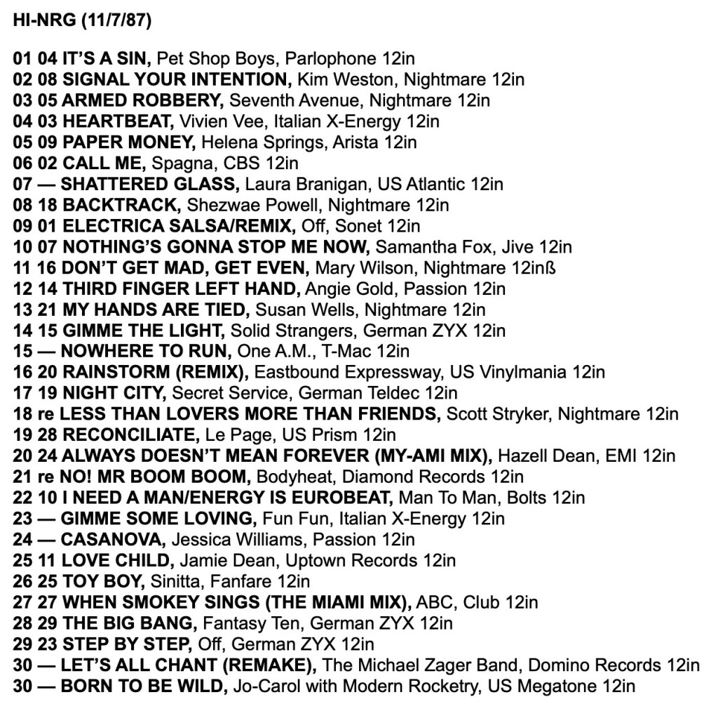 As a taste for the tracks in these charts, here is a mix I made from the Record Mirror Top 50 Hi-NRG tracks of 1987: