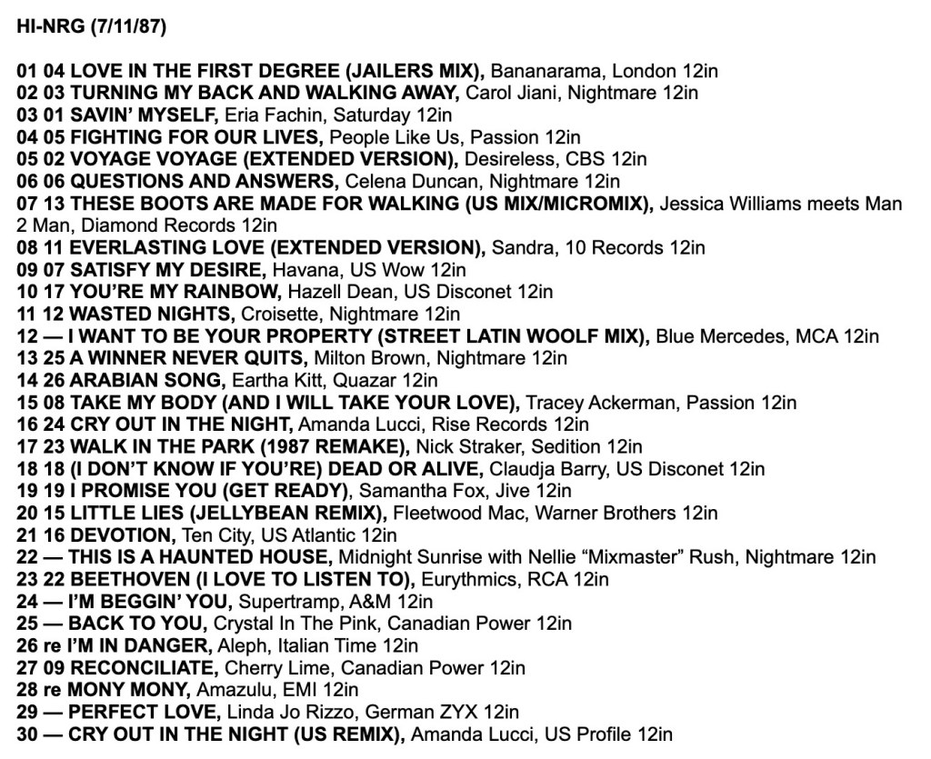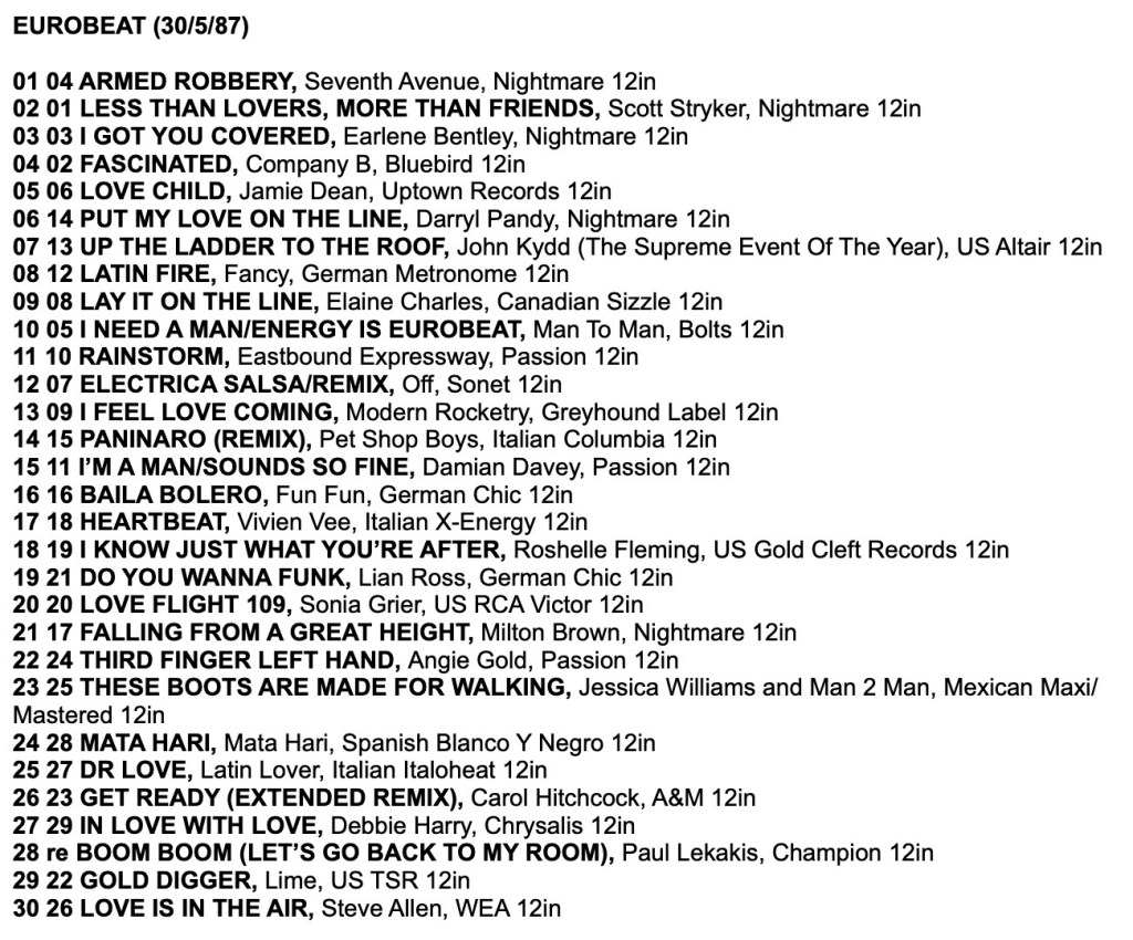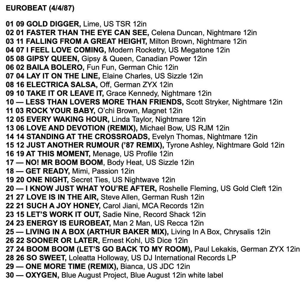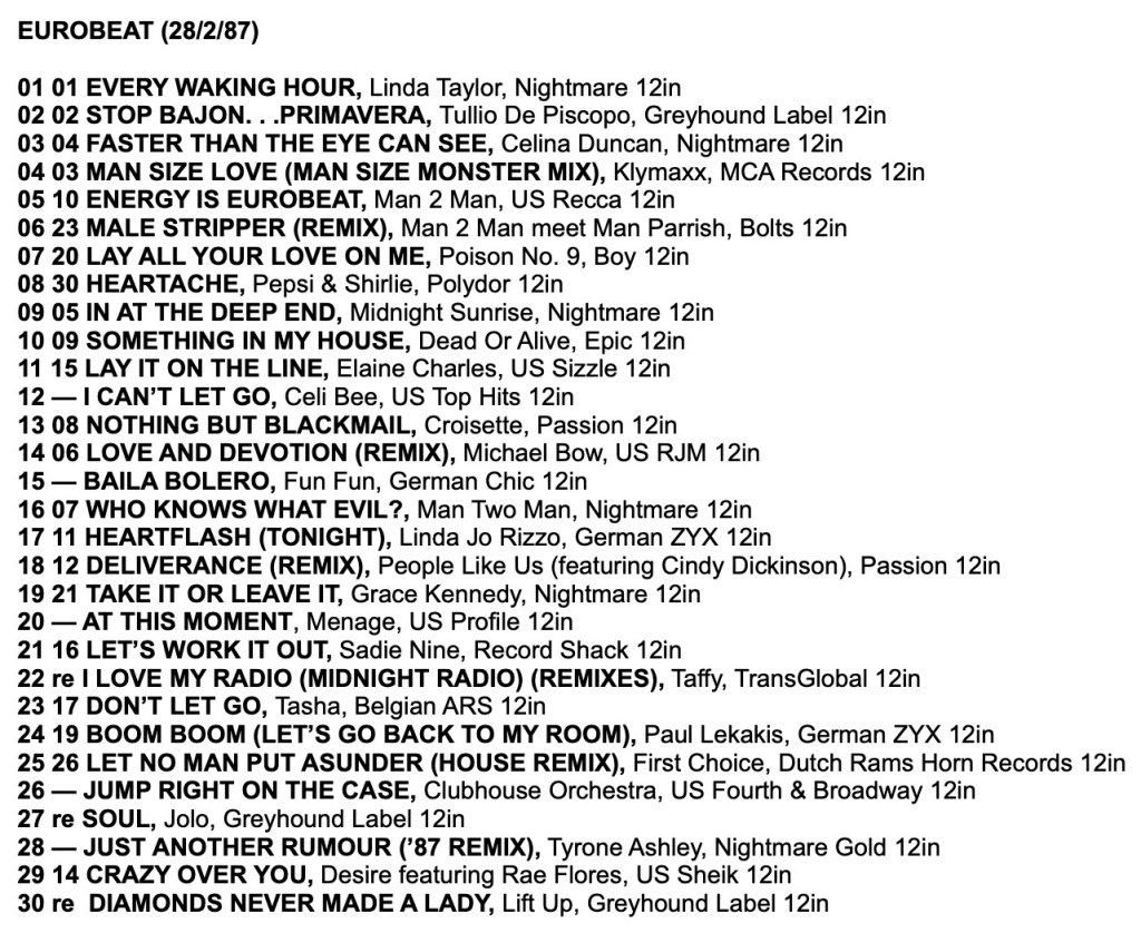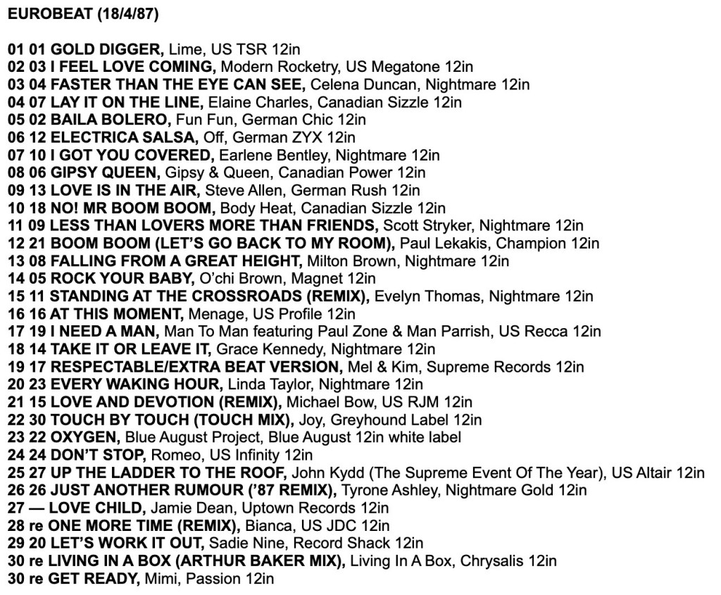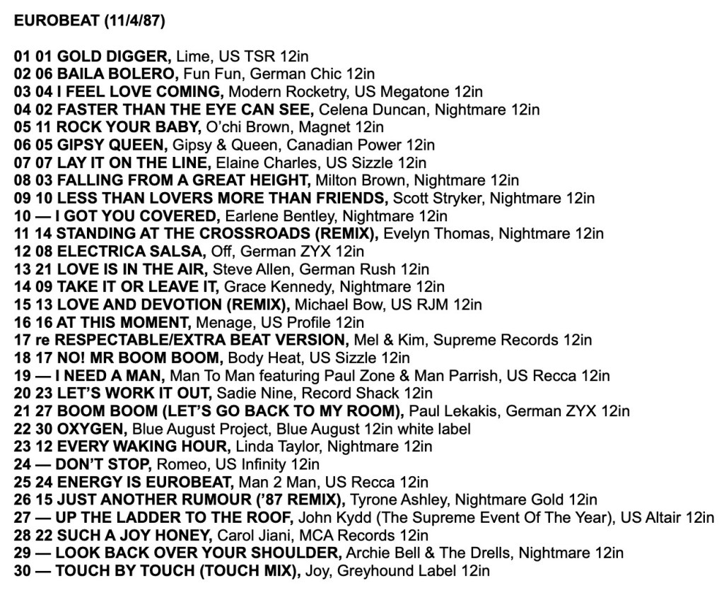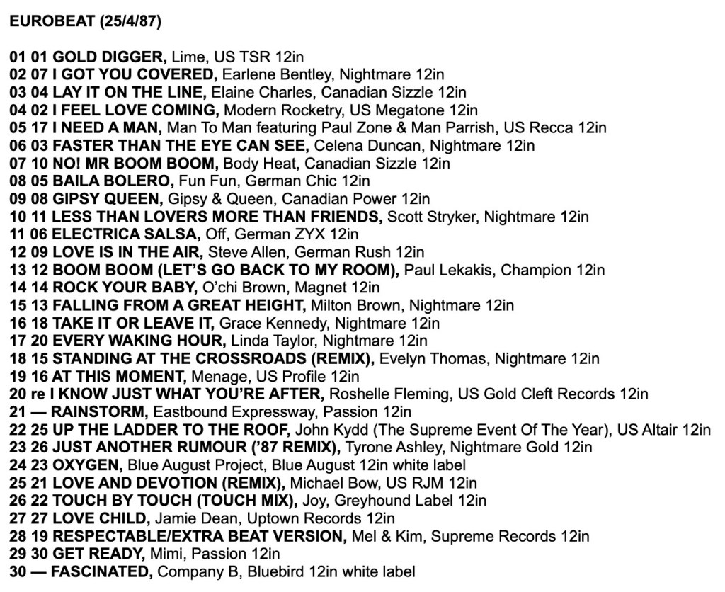 As a taste for the tracks in these charts, here is a mix I made from the Record Mirror Top 50 Hi-NRG tracks of 1987: