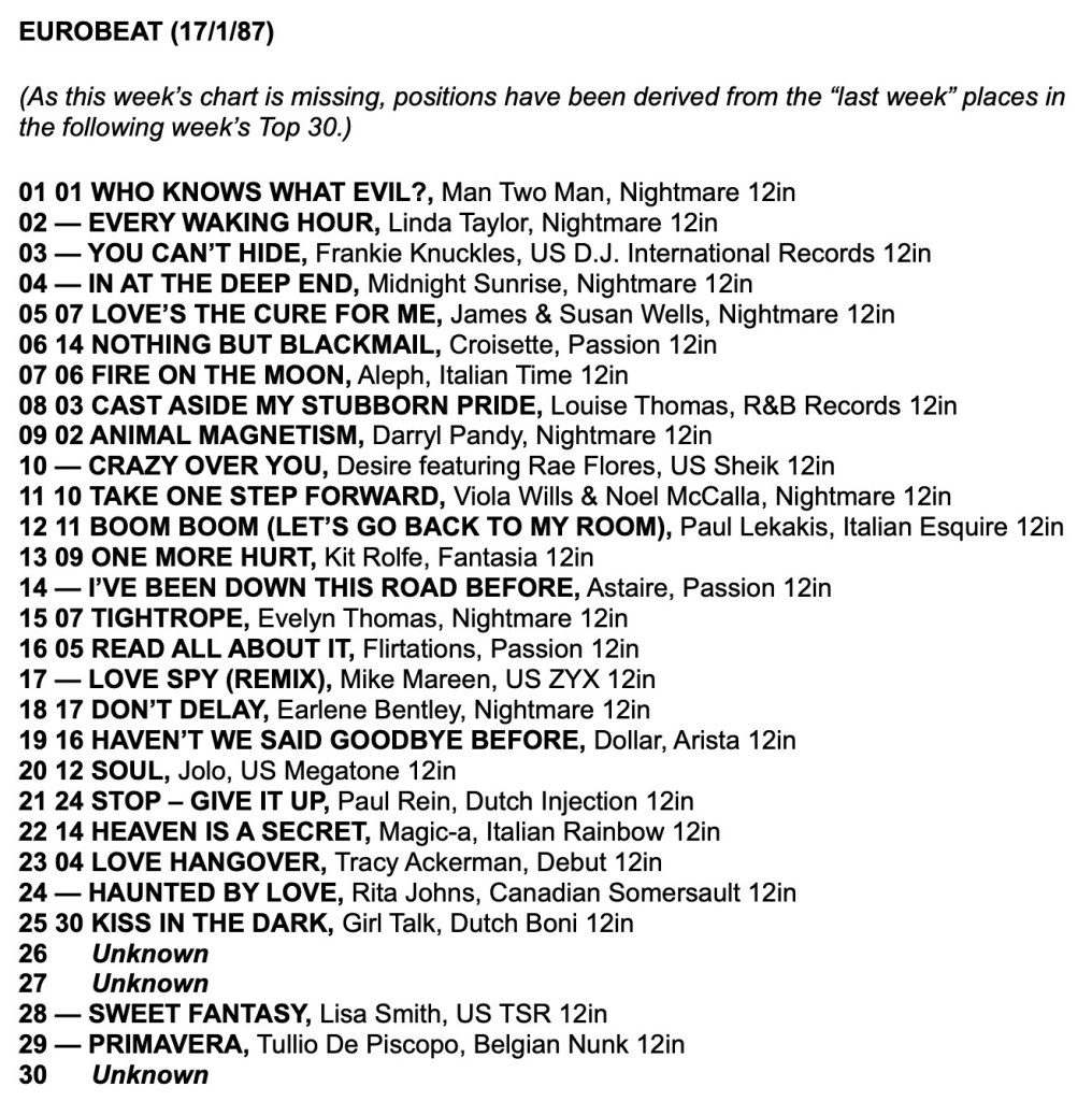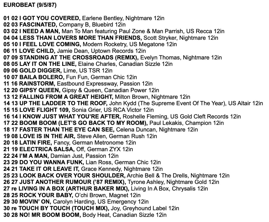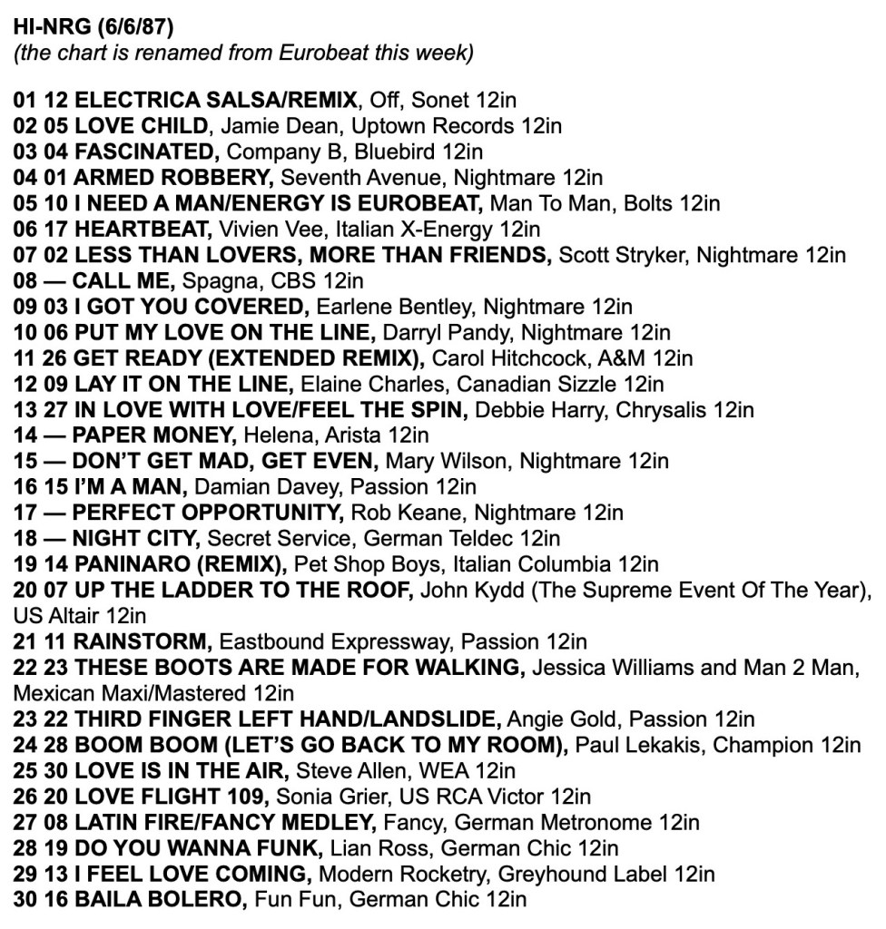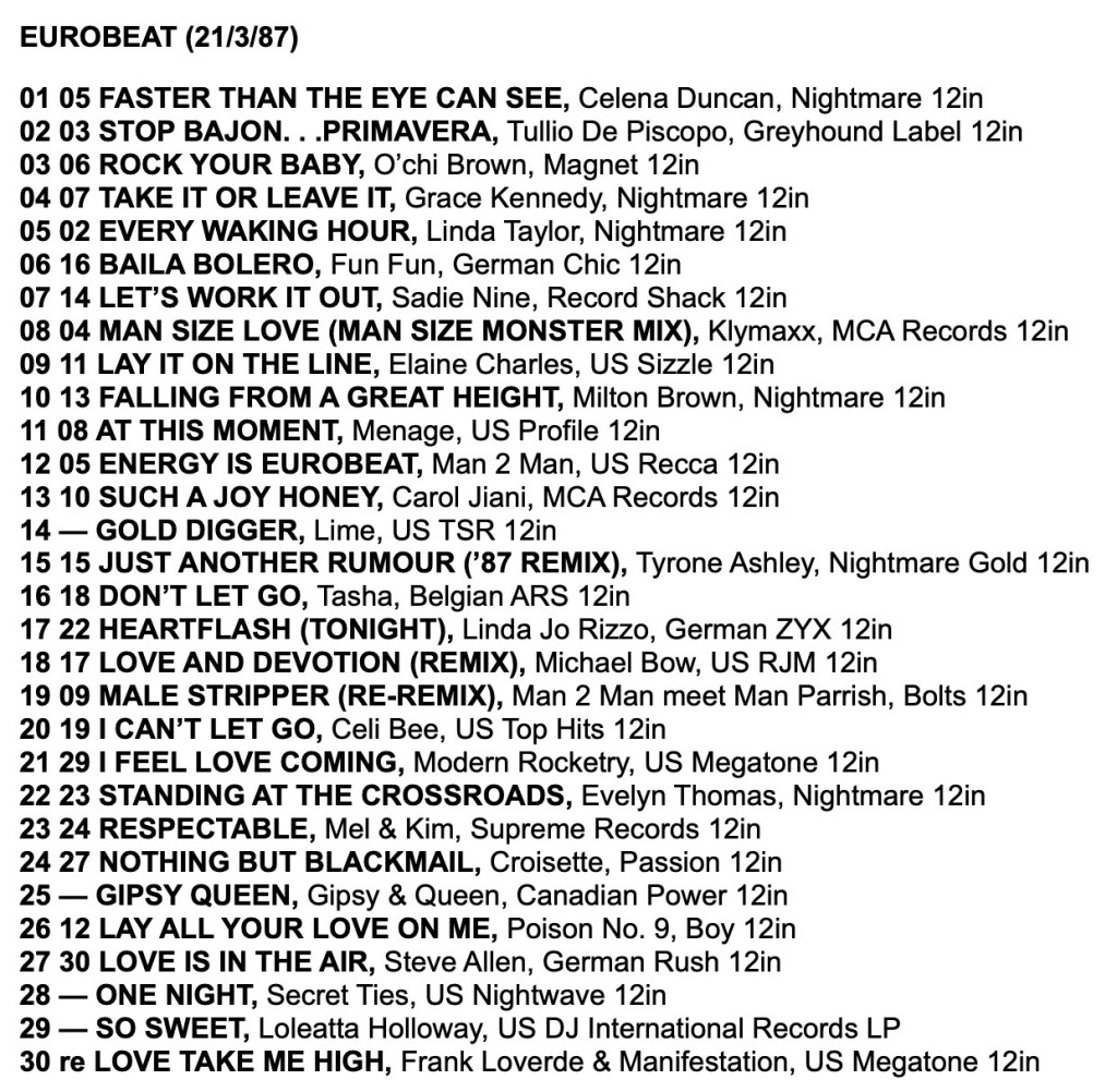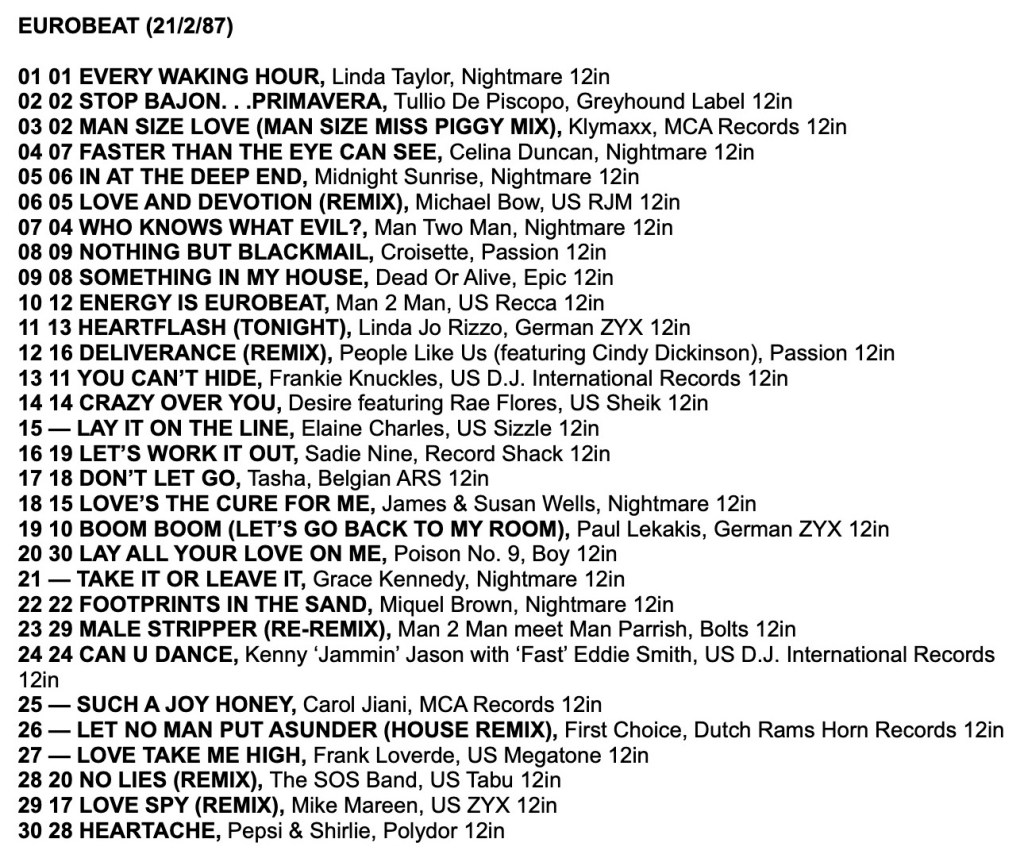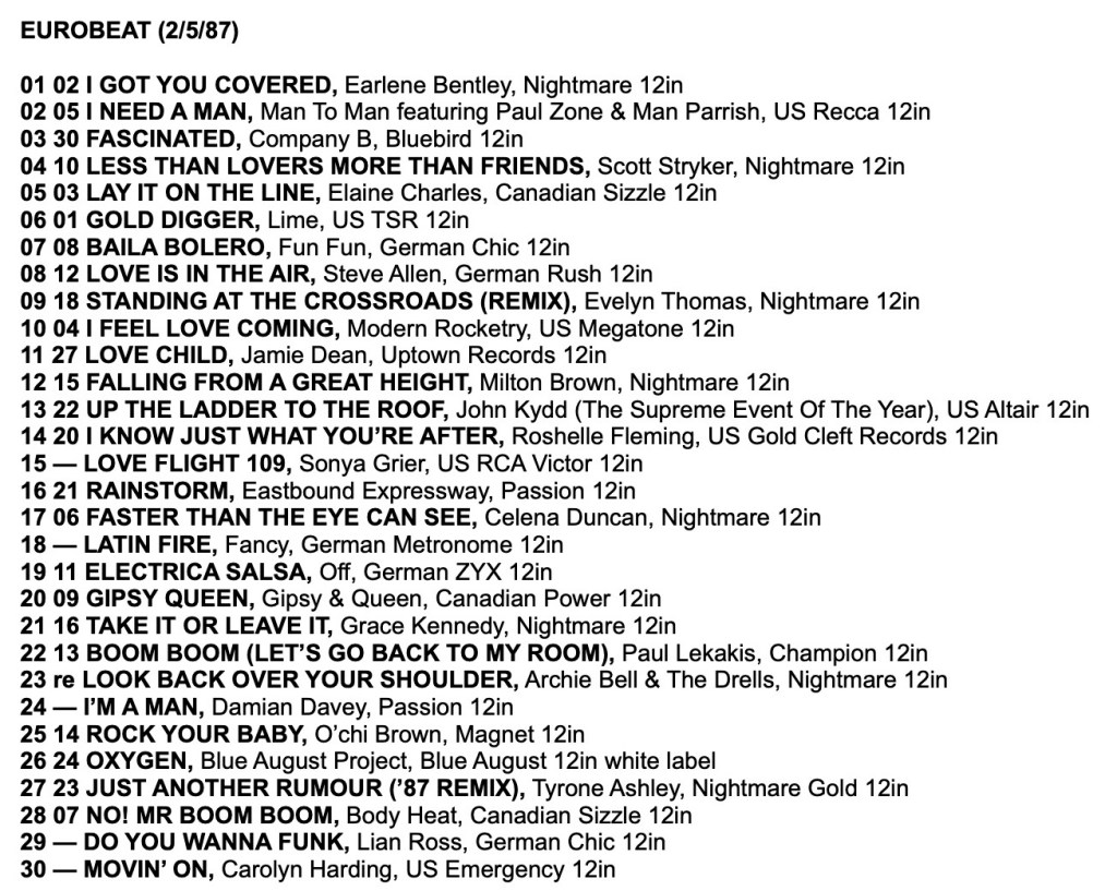 As a taste for the tracks in these charts, here is a mix I made from the Record Mirror Top 50 Hi-NRG tracks of 1987: