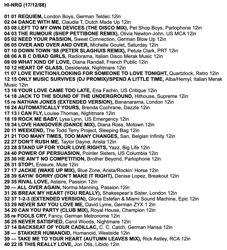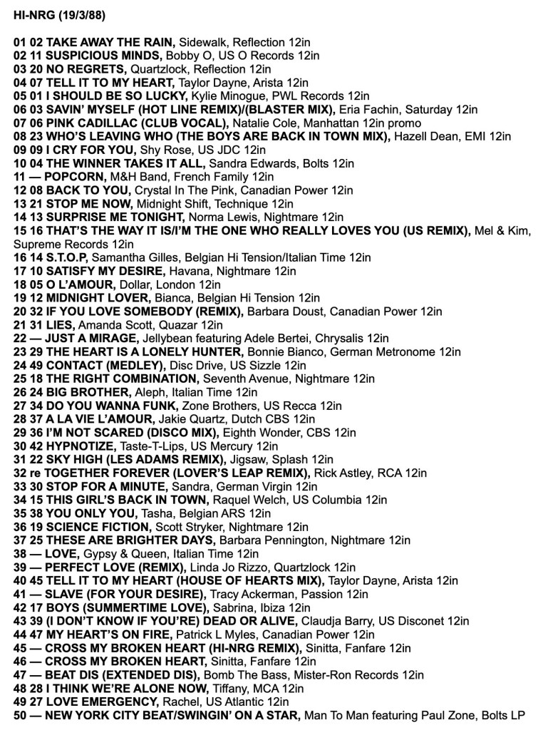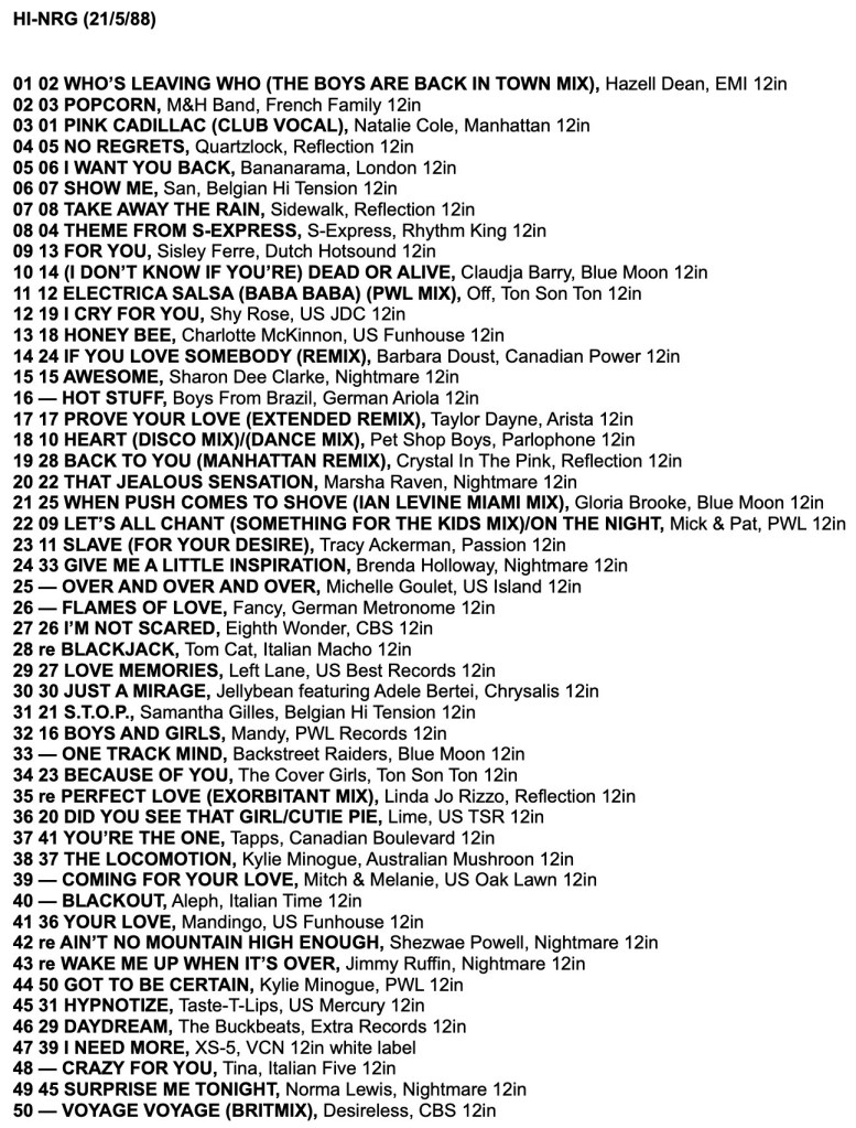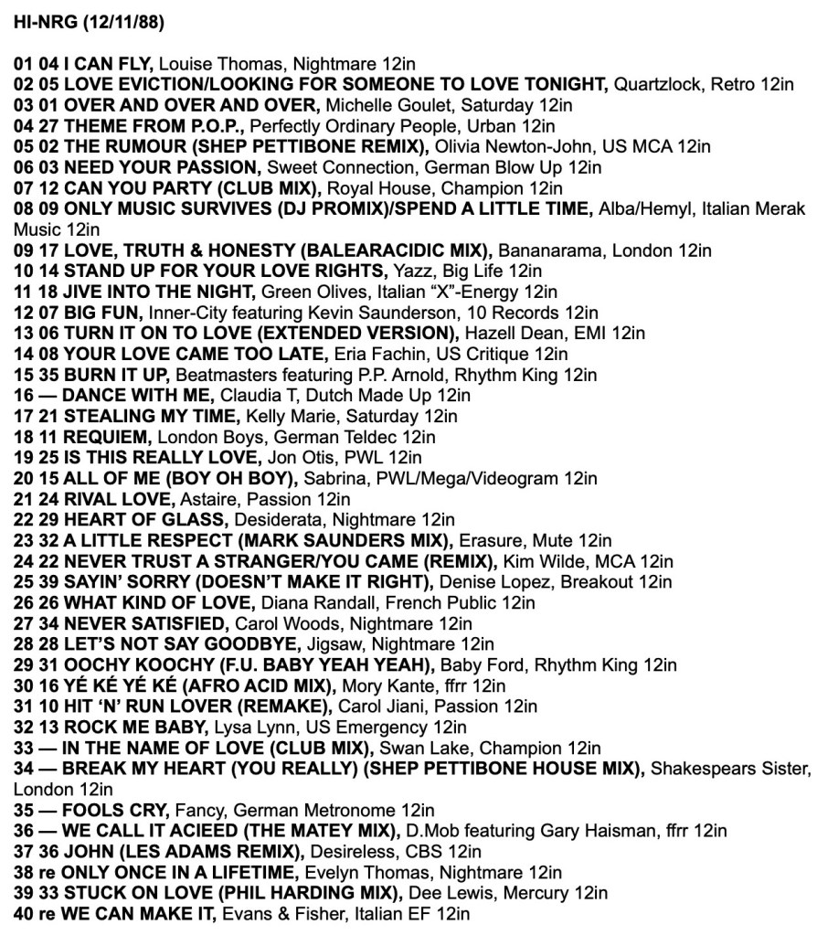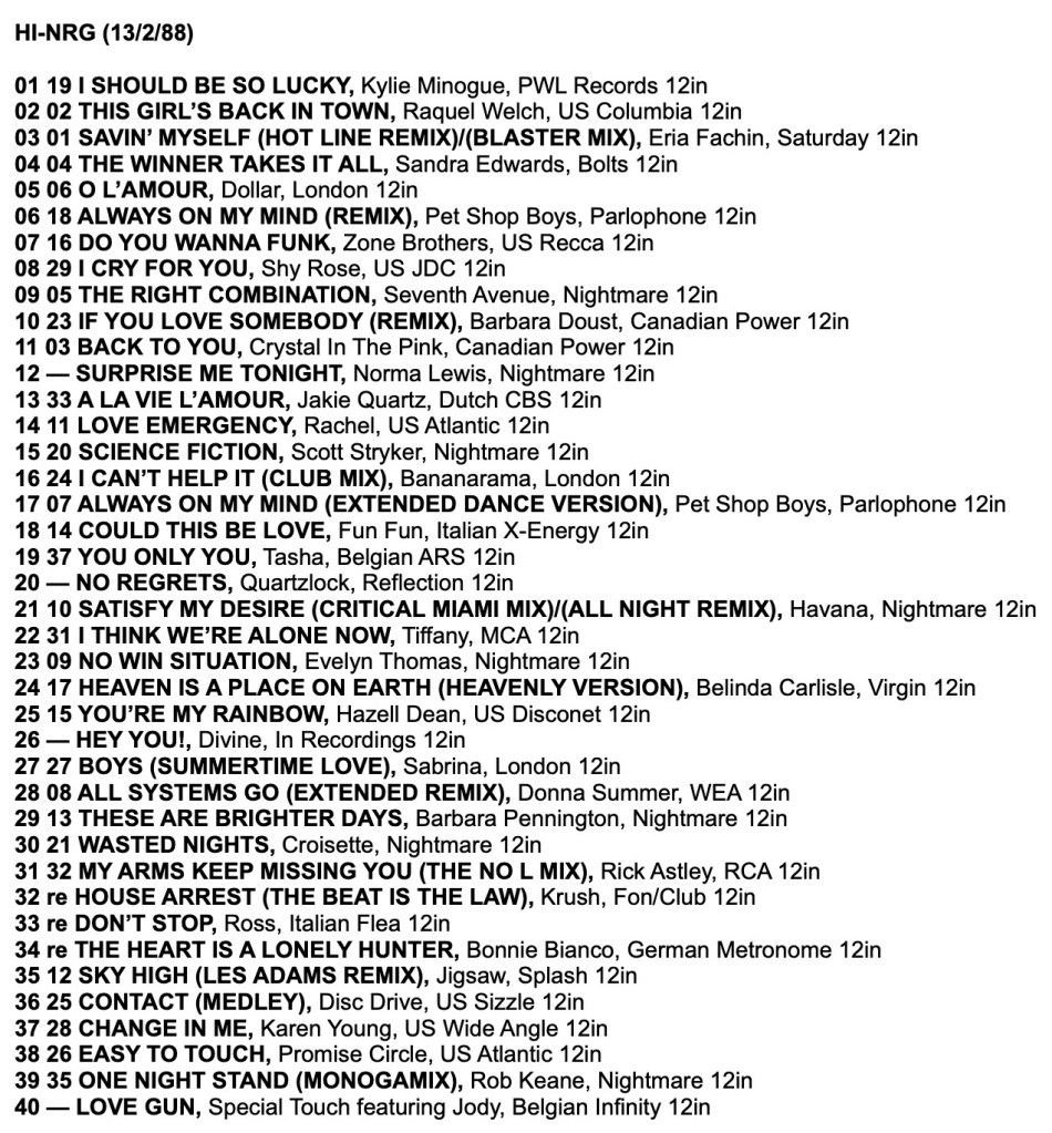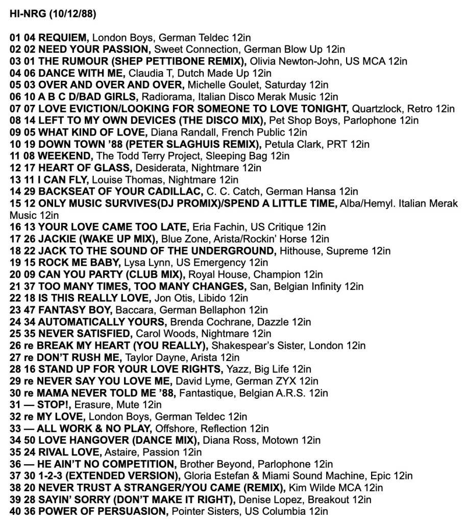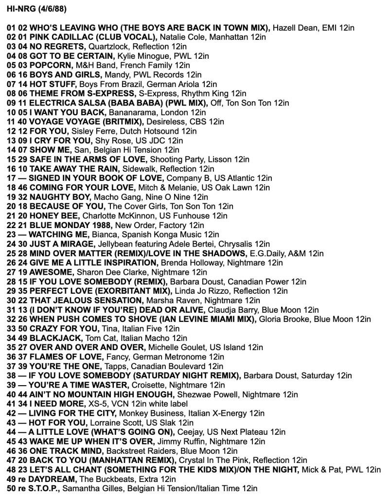 As a taste for the tracks in these charts, here is a mix I made from the Record Mirror Top 50 Hi-NRG tracks of 1988:
