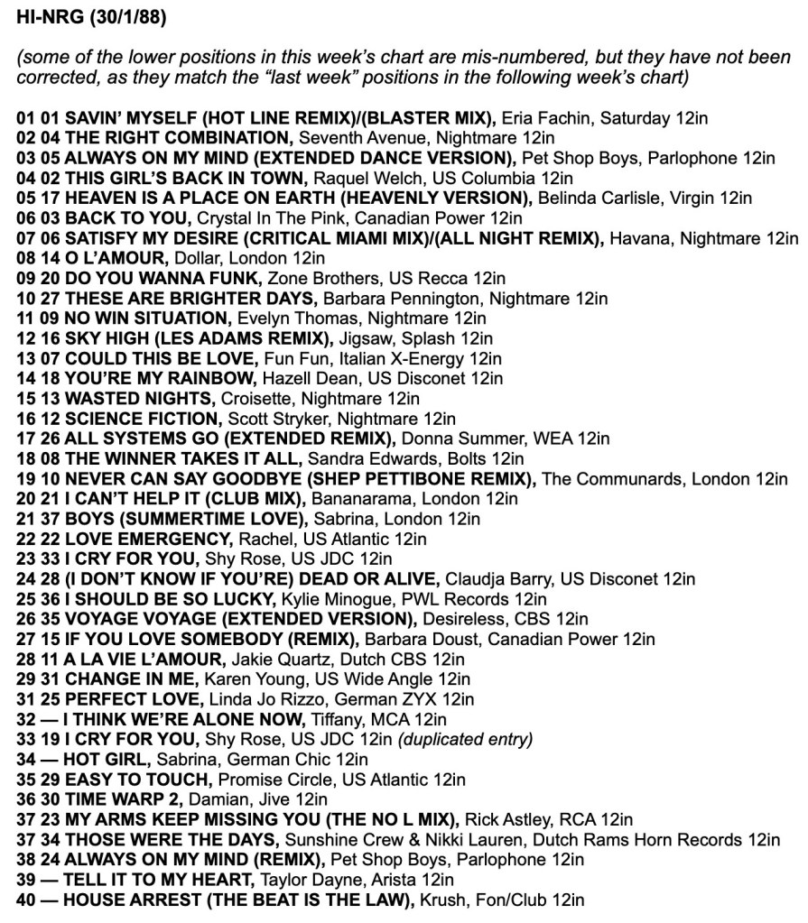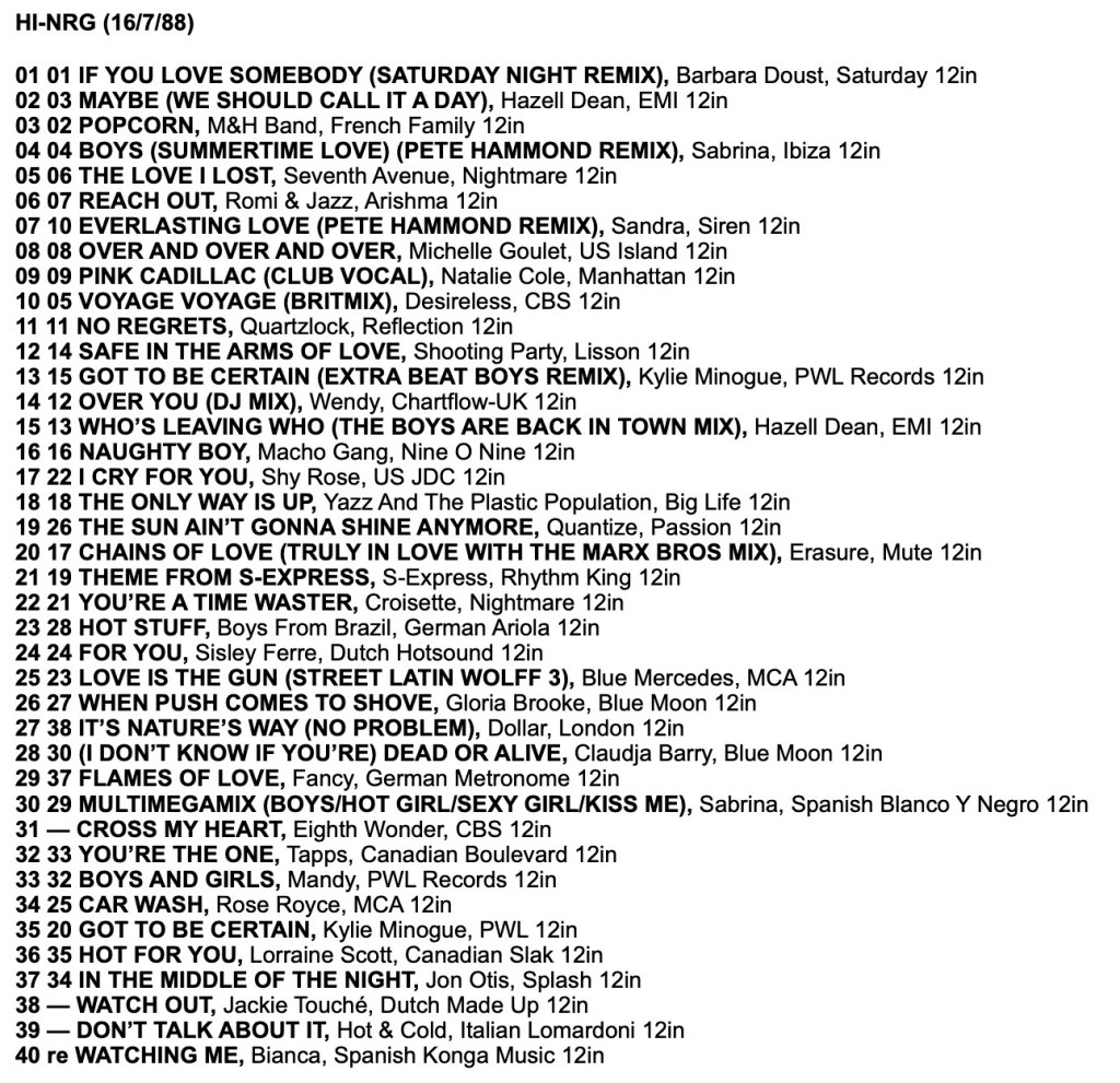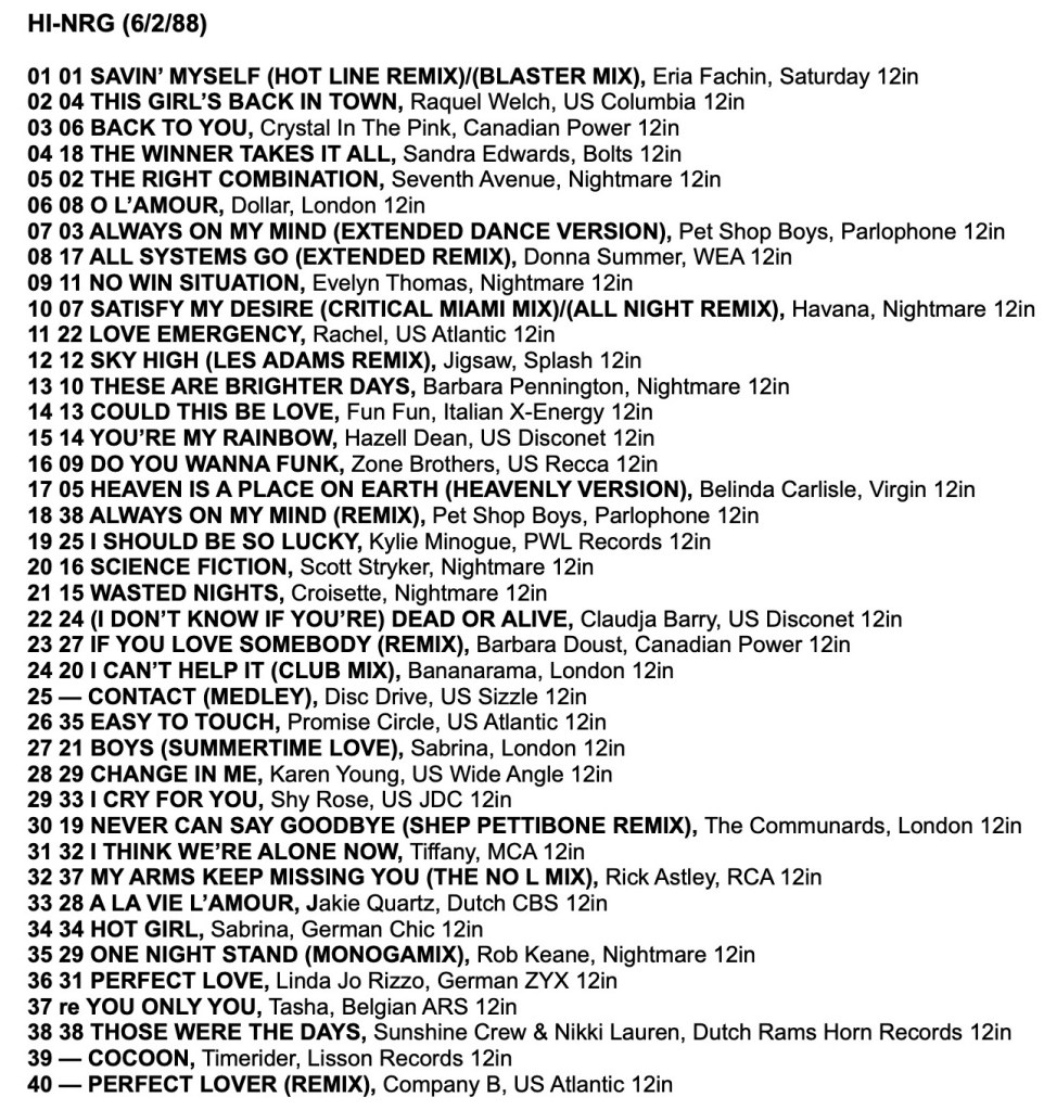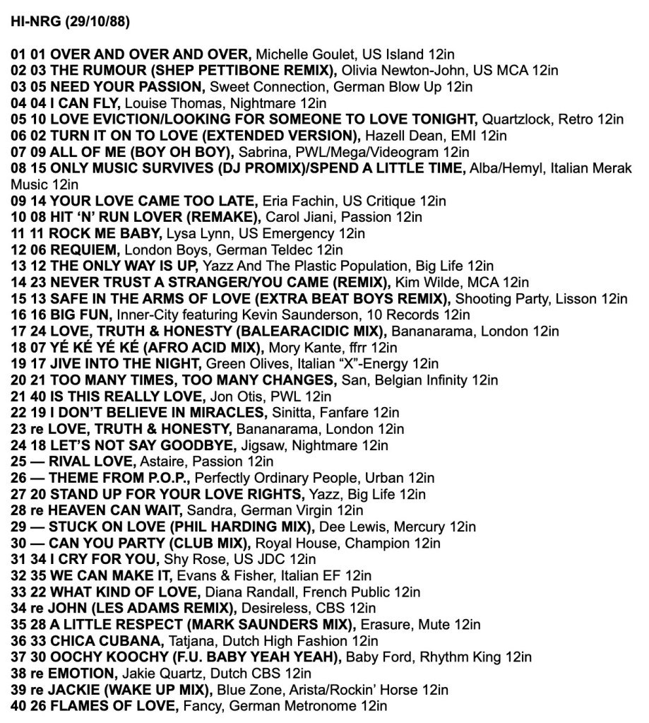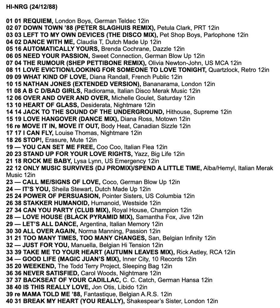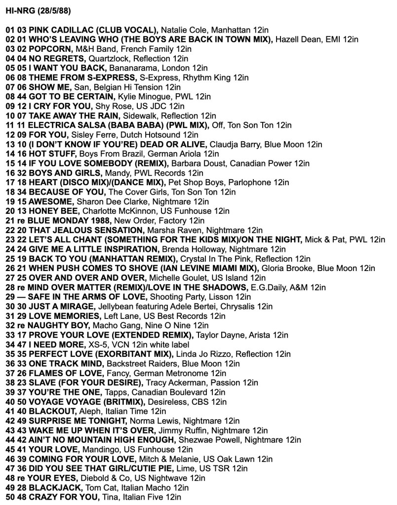 As a taste for the tracks in these charts, here is a mix I made from the Record Mirror Top 50 Hi-NRG tracks of 1988: