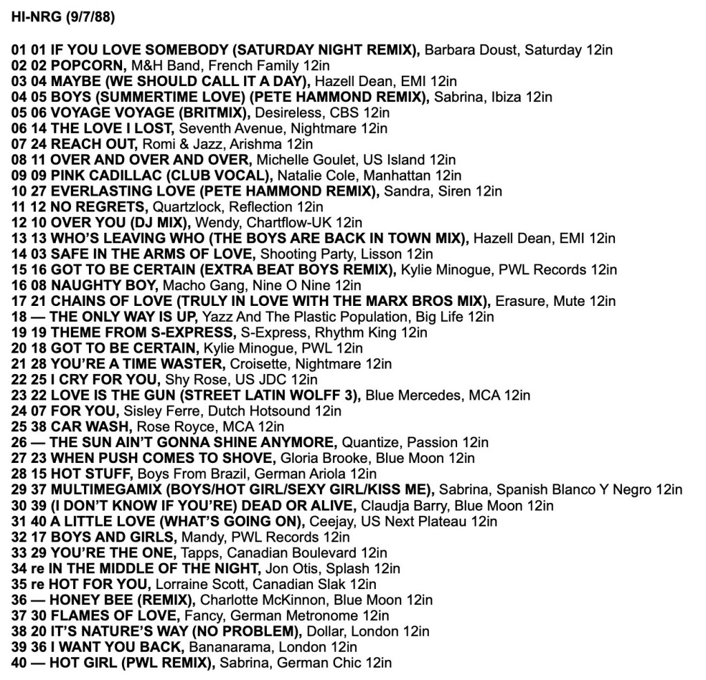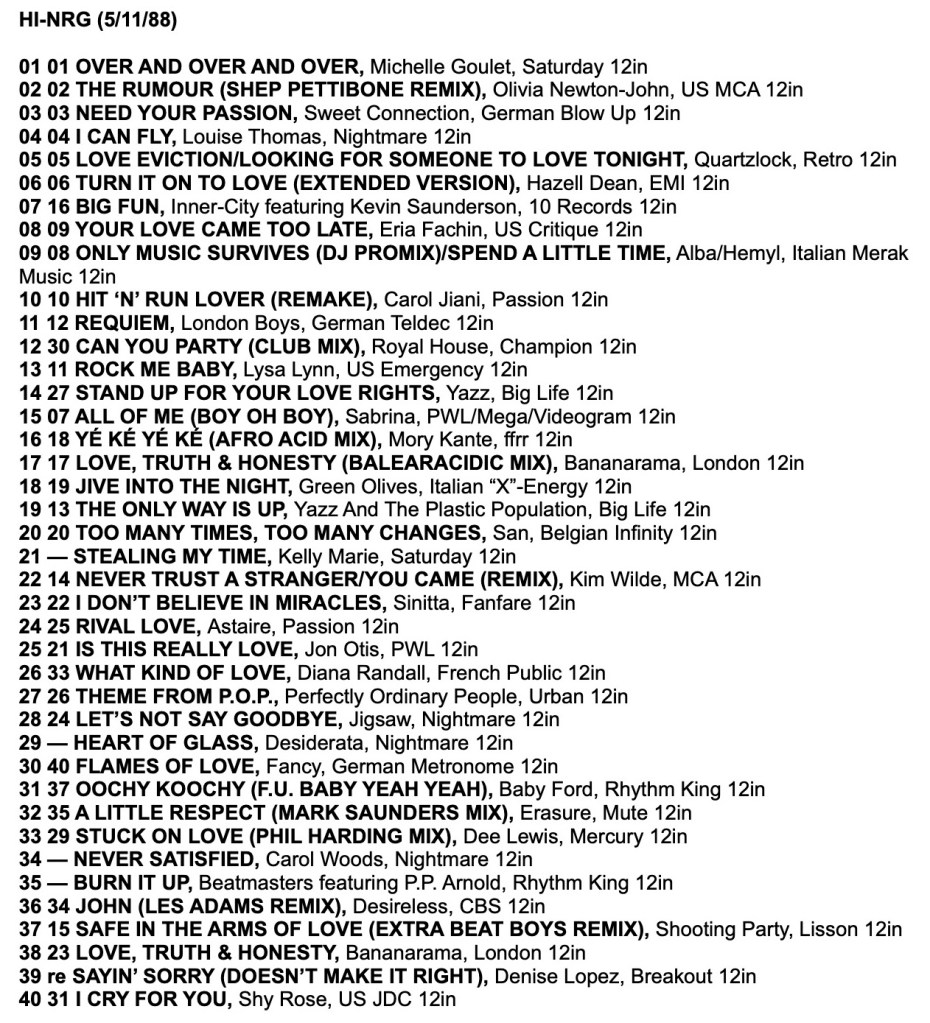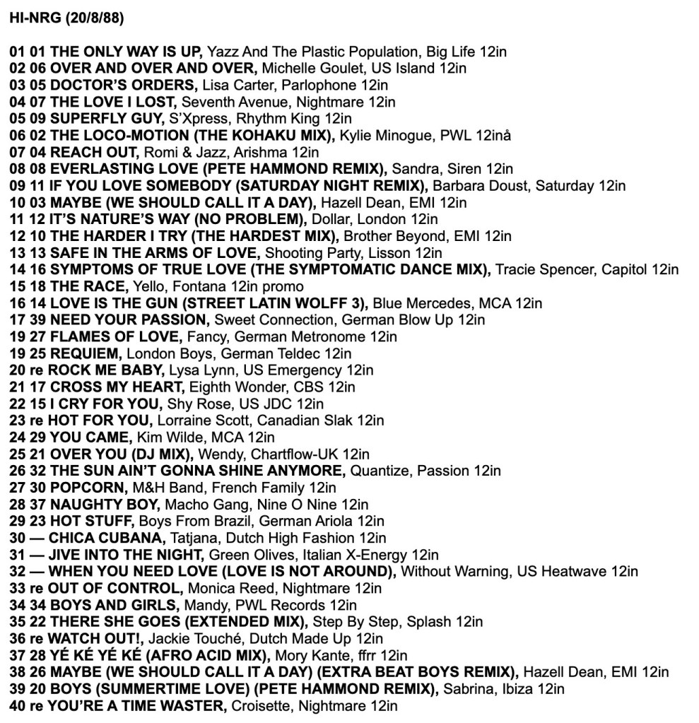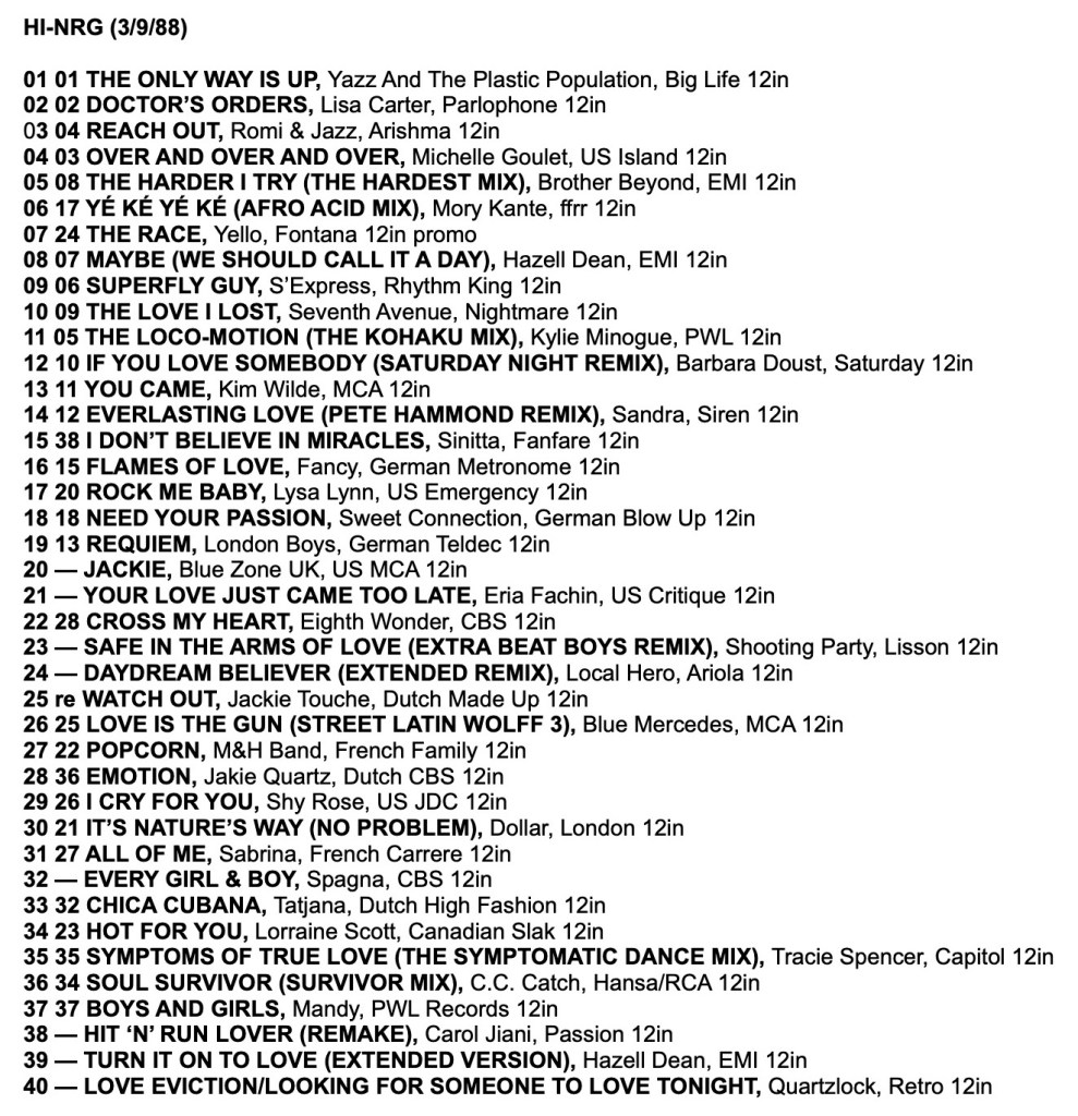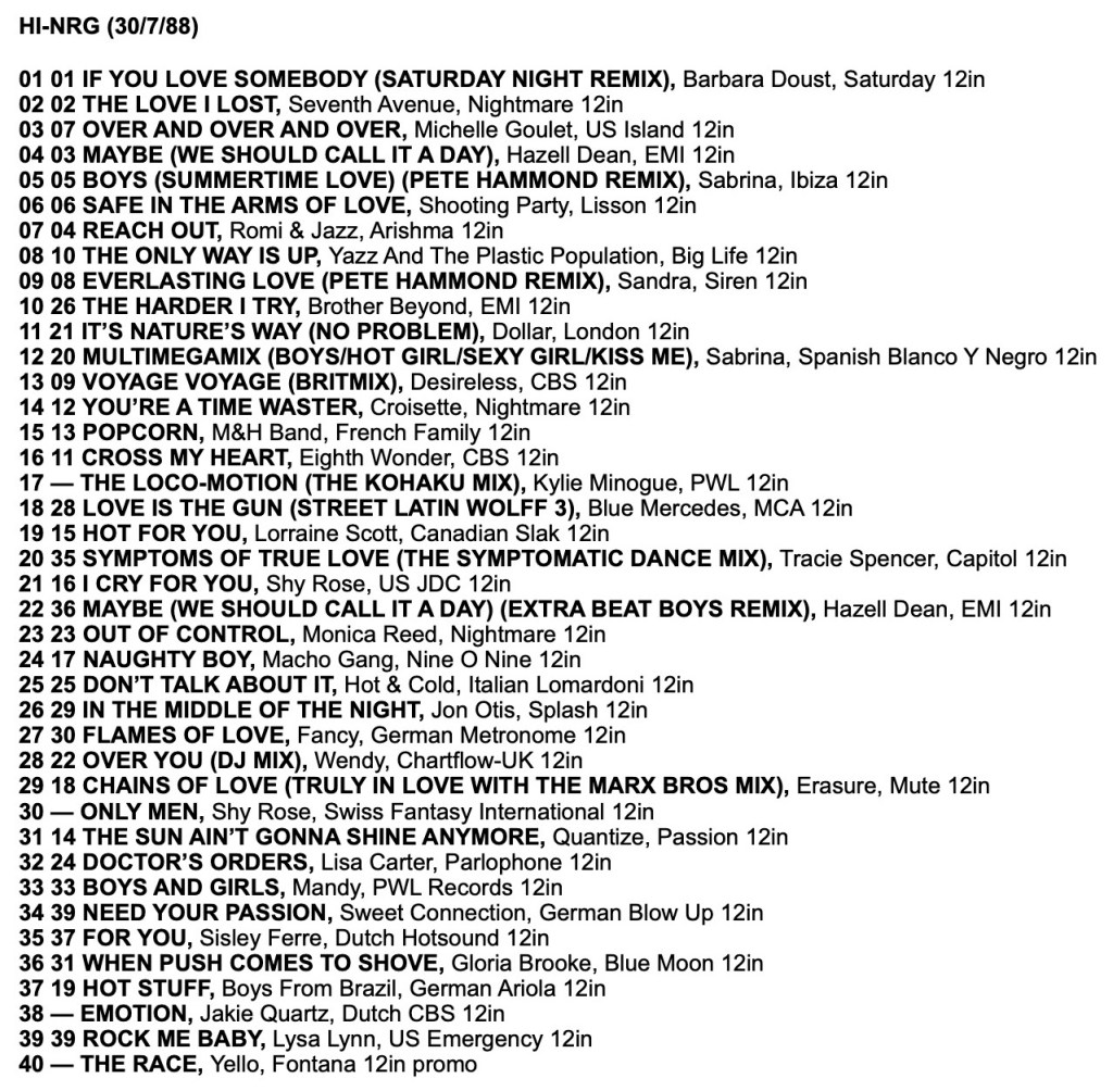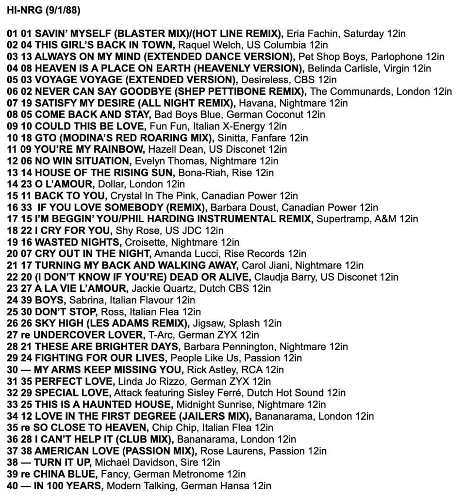 As a taste for the tracks in these charts, here is a mix I made from the Record Mirror Top 50 Hi-NRG tracks of 1988: