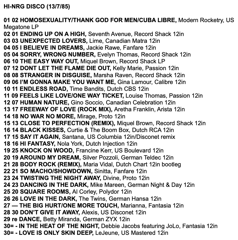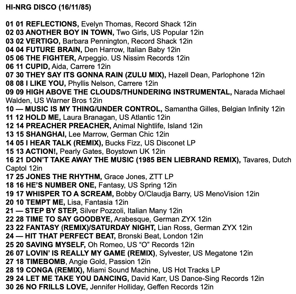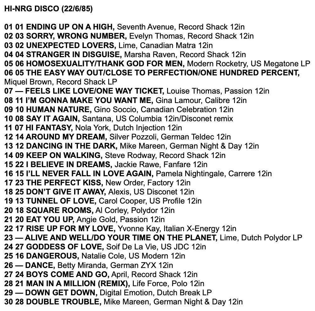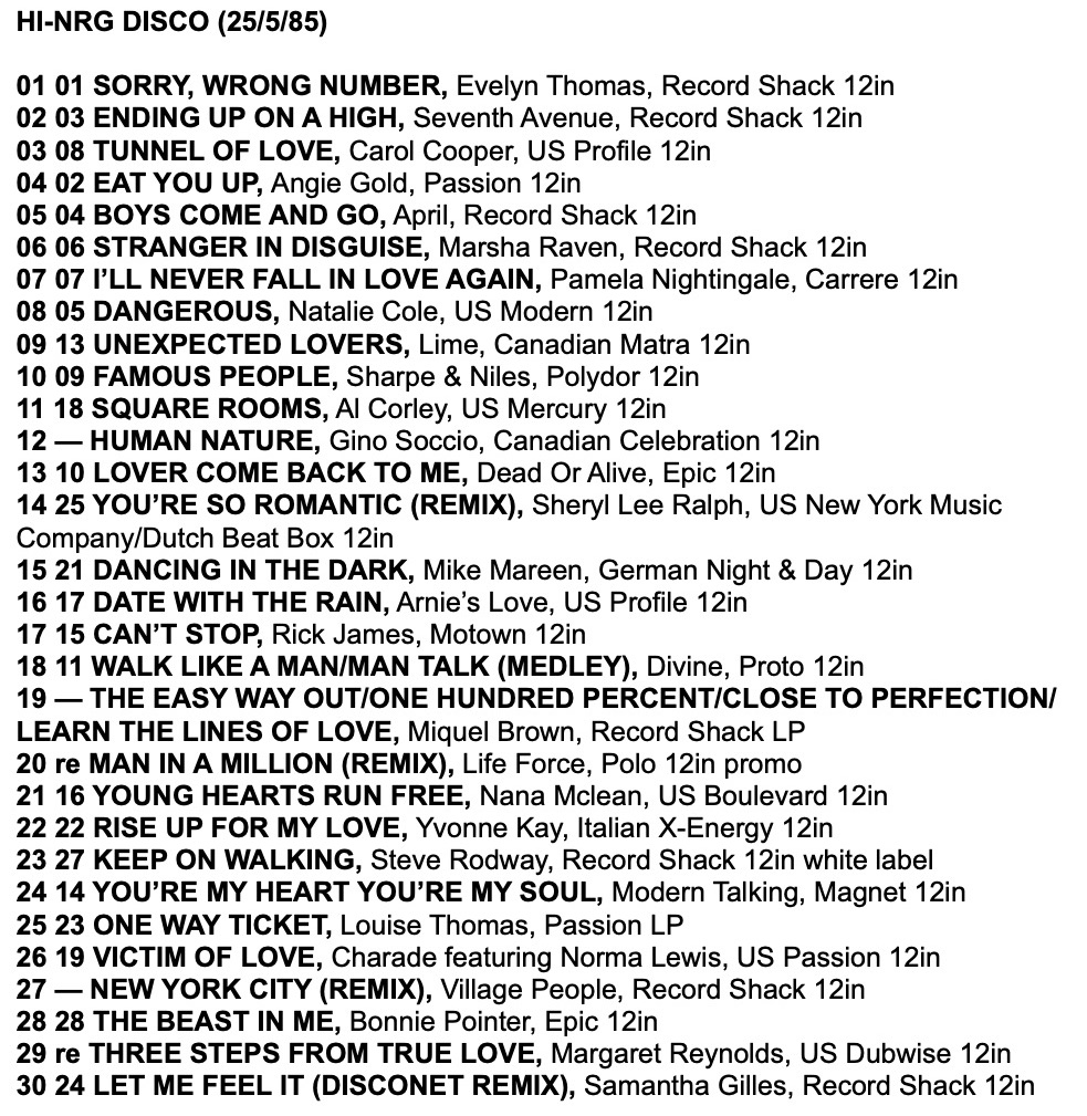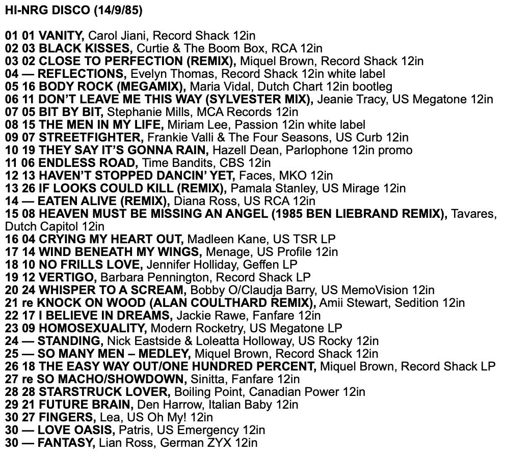 As a taste for the tracks in these charts, here is a mix I made from the Record Mirror Top 30 Hi-NRG tracks of 1985
