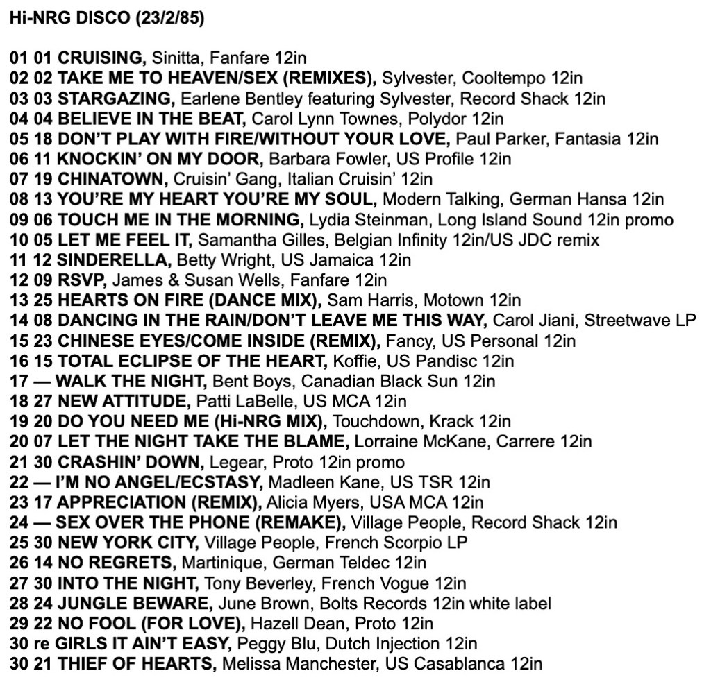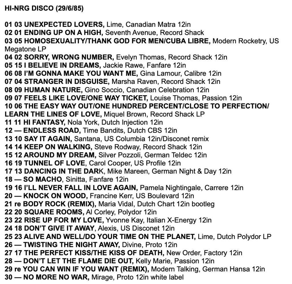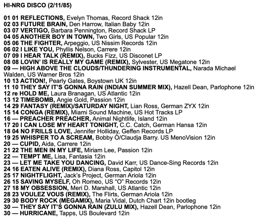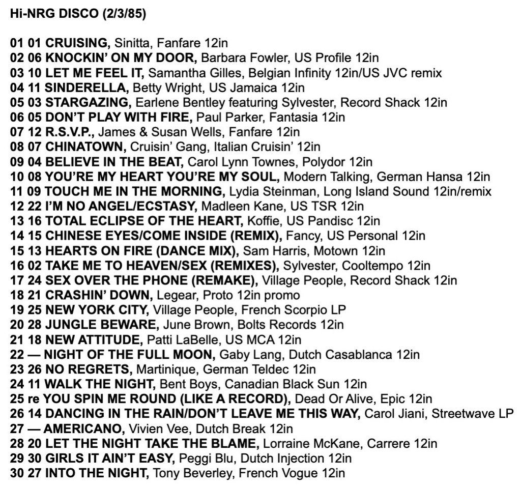 As a taste for the tracks in these charts, here is a mix I made from the Record Mirror Top 30 Hi-NRG tracks of 1985