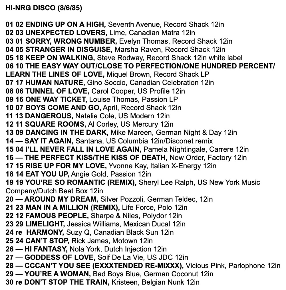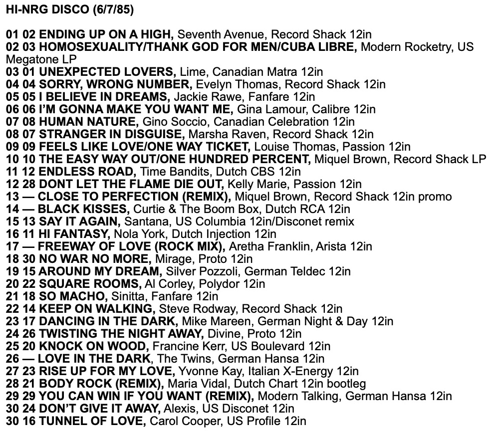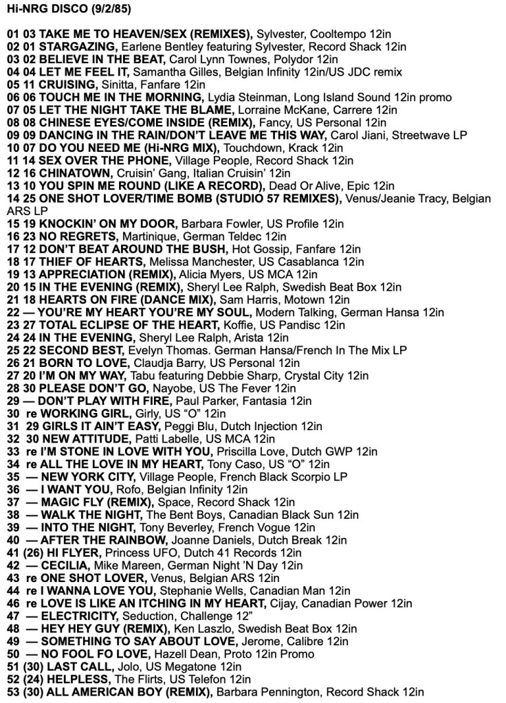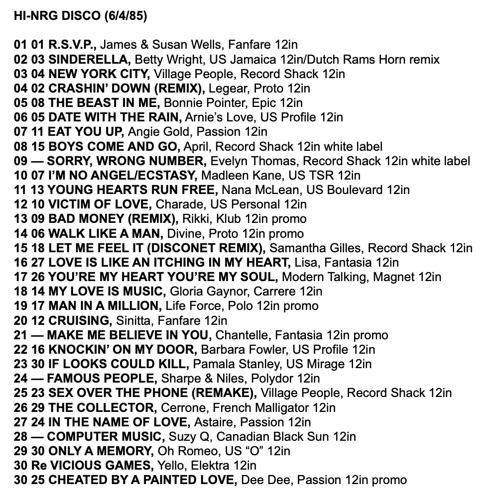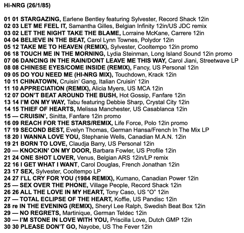As a taste for the tracks in these charts, here is a mix I made from the Record Mirror Top 30 Hi-NRG tracks of 1985